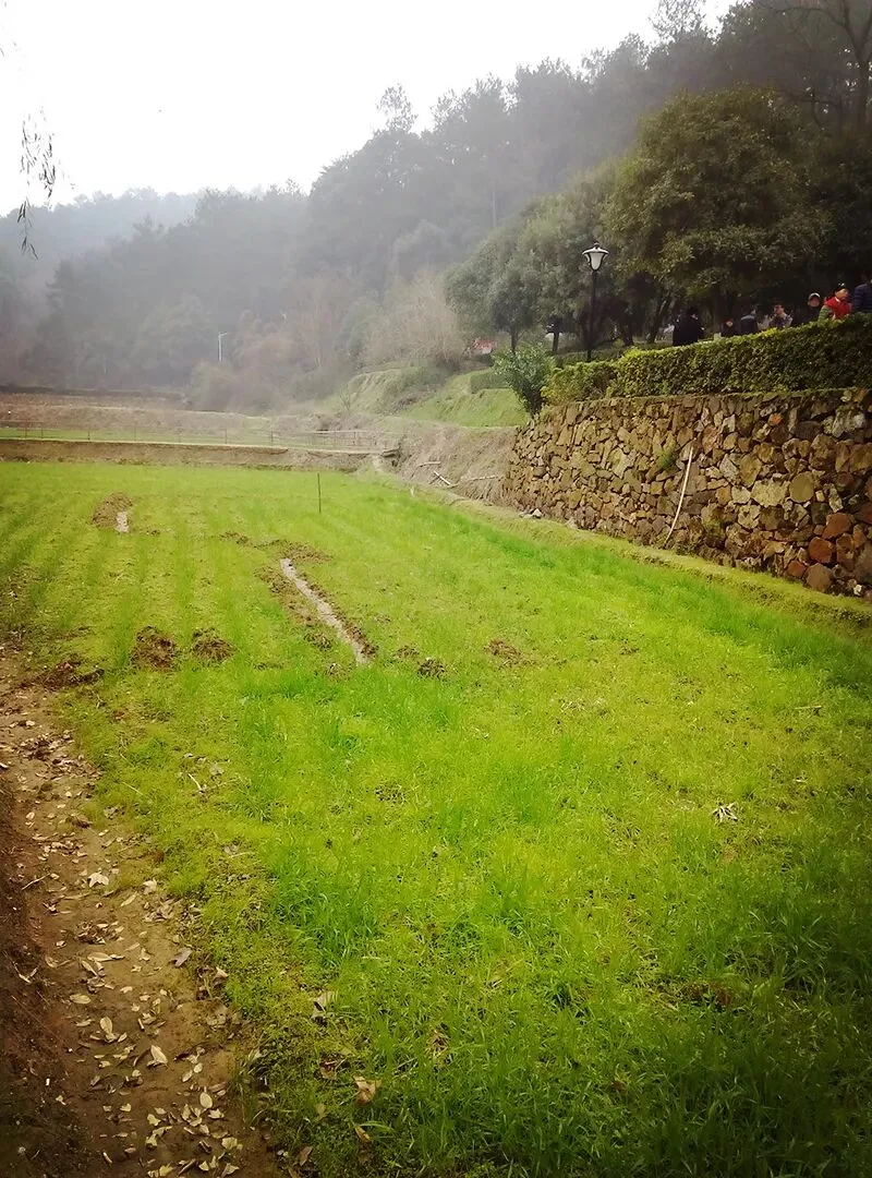 竹林旁边是一块菜园,土被翻过,还没来得及种下什么。再过去是一片稻田,稻子已经收割了,只剩下短短的稻茬,在雨里泛着浅浅的黄。田埂上长着野草,湿漉漉的,踩上去软软的。