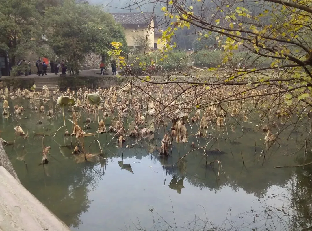 毛泽东故居是一栋典型的湖南农村民居,土砖墙,青瓦顶,坐南朝北,背靠着山。屋前是一口池塘,水面上浮着几片残荷,枯茎一根根立着,在雨里显得格外安静。荷花已经谢了,只剩下那些枯黄卷曲的叶子,和光秃秃的茎秆,像一幅水墨画里的留白。