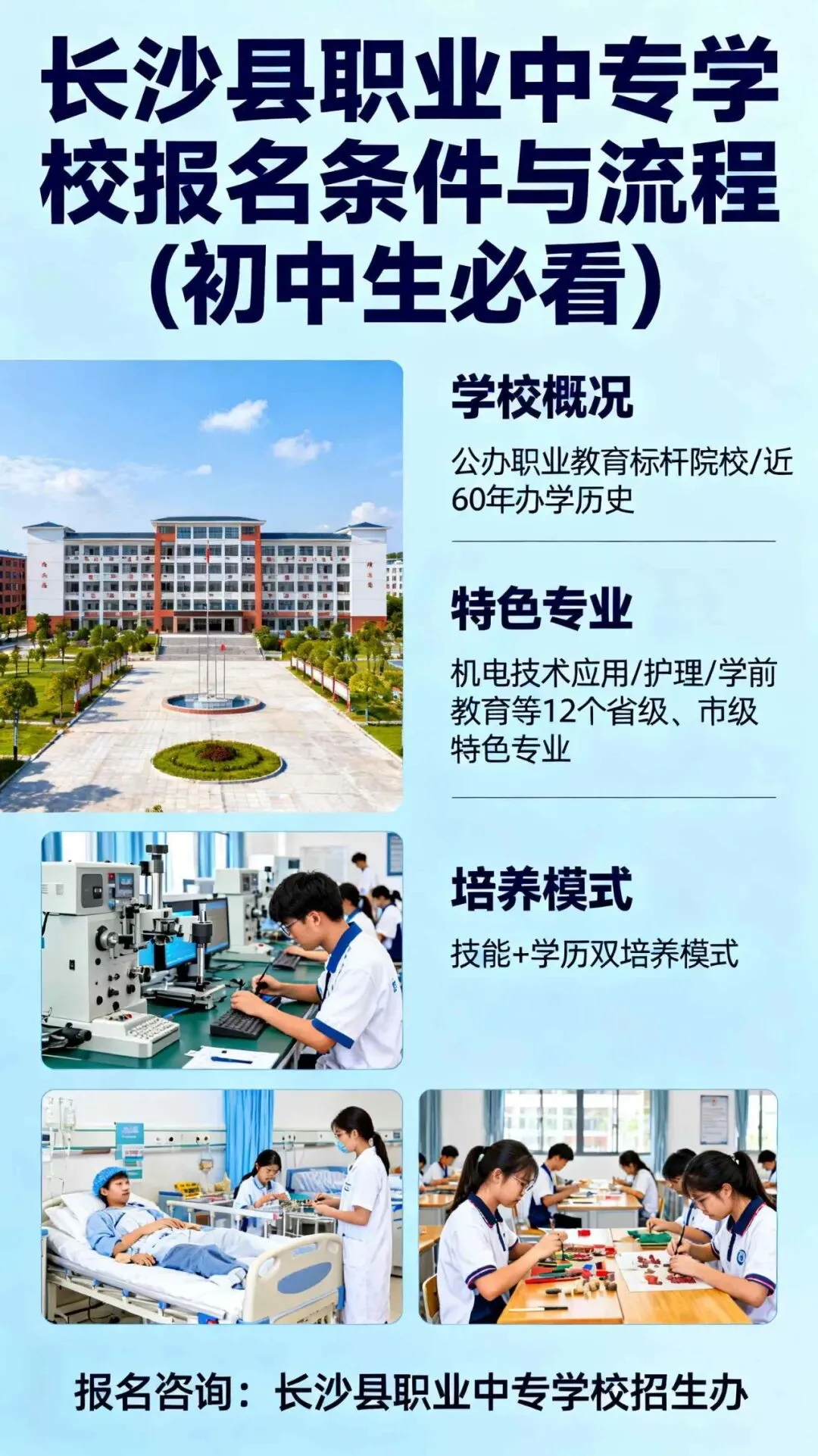长沙县职业中专学校是长沙县公办职业教育的标杆院校,拥有近60年办学历史,开设了机电技术应用、护理、学前教育等12个省级、市级特色专业,凭借“技能+学历”的双培养模式,成为众多初中毕业生实现职业理想的重要跳板。对于有意向报考的初中生来说,提前摸清报名条件与流程,是开启技能成才之路的第一步。
