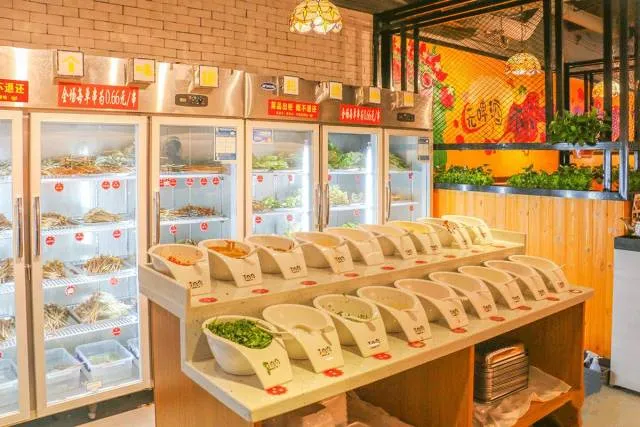 无论荤素都是6毛6一串,盘菜的话是有价格区间的。自助拿串,冰柜大致分为三大种类:荤菜串串、素菜串串以及各色盘菜。