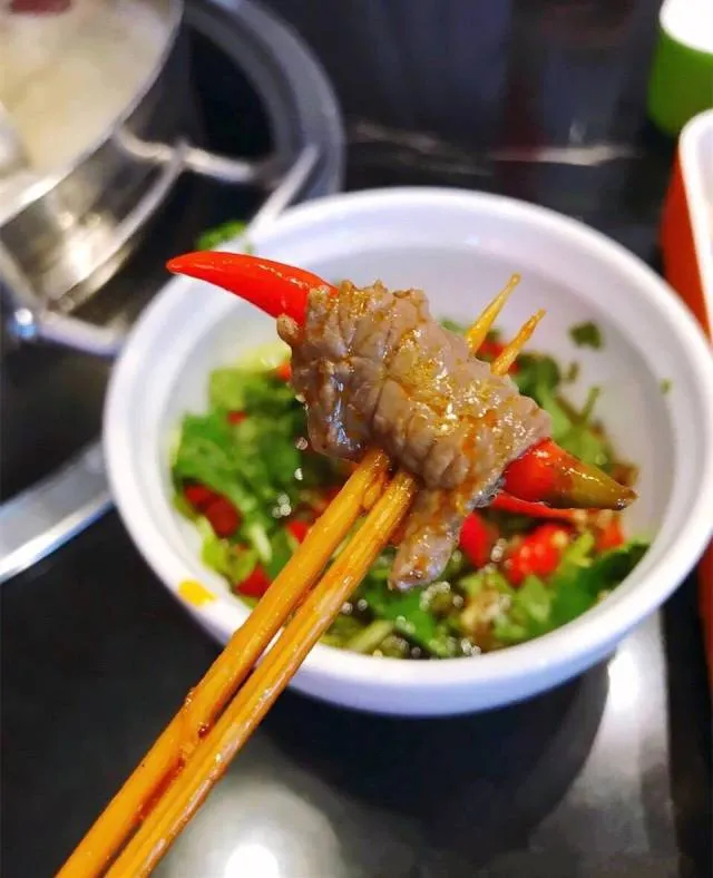 牛肉在汤锅浸足了时间,吸足了汤锅的鲜香美味,肉质细嫩不粘牙,蘸着调味碟一口下去,过瘾!