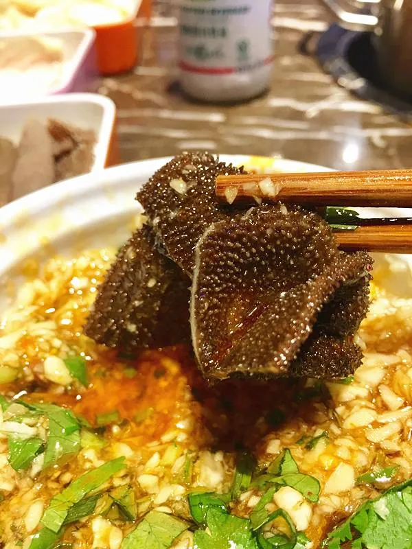 “鸭掌筋”,整个都是鸭掌中间抽出来的筋。烫好后嚼在嘴里鲜嫩又有嚼劲,掌咬起来咯吱咯吱的,香脆有嚼劲。