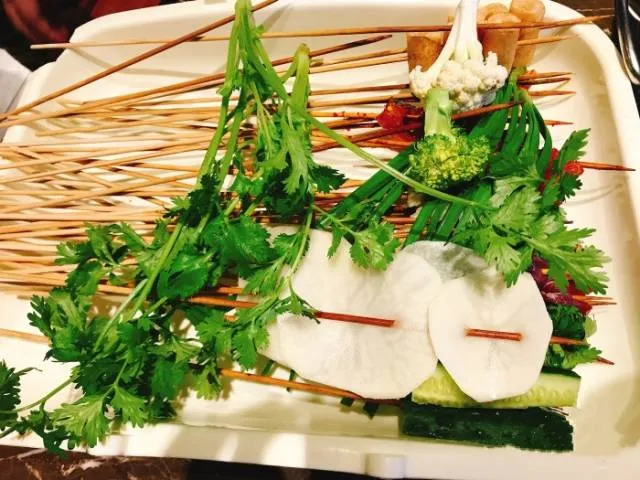 从猪牛羊到鱼虾蟹等一概俱全,素食可选腐竹、藕片、土豆...所有东西都是用签子串,你只需要挑选好自己所需要的食材。