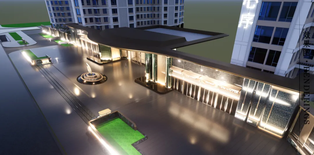 主出入口大门,宽度超80米,两侧采用仿蓝钻岩板与仿西西里灰岩板组合铺贴,是整个板块最气派、豪奢的大门。