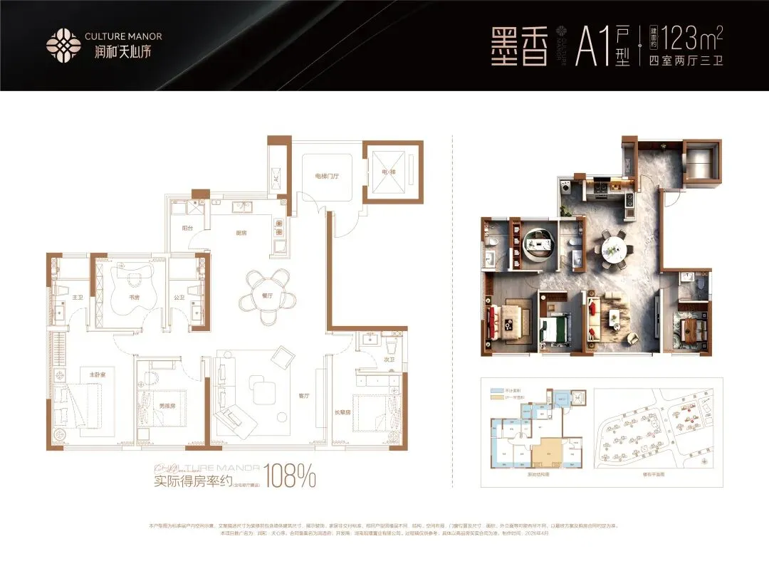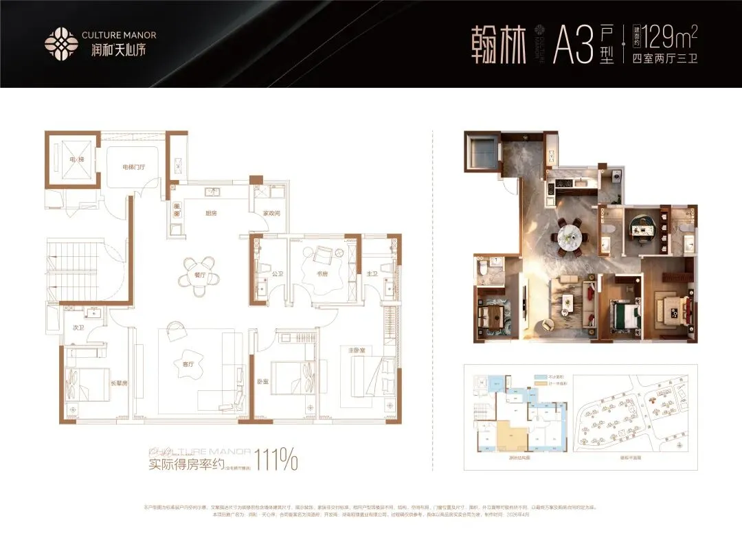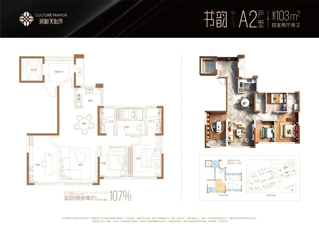 尺度进一步升级,含电梯厅后得房率分别高达108%、111%,客厅开间分别做到了约4米、约5.4米,空间感和通透性可媲美老规140㎡。