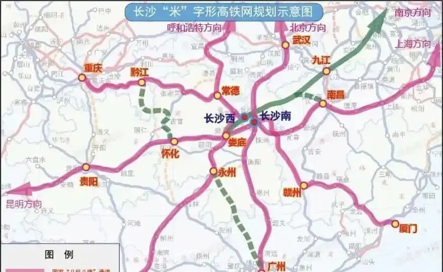 根据目前的规划和建设进度,长沙“米”字形高铁网主要还差东北向的长九高铁和西南向的长韶娄高铁这关键的“两笔”。目前长沙的“米”字形骨架基础是这样:
