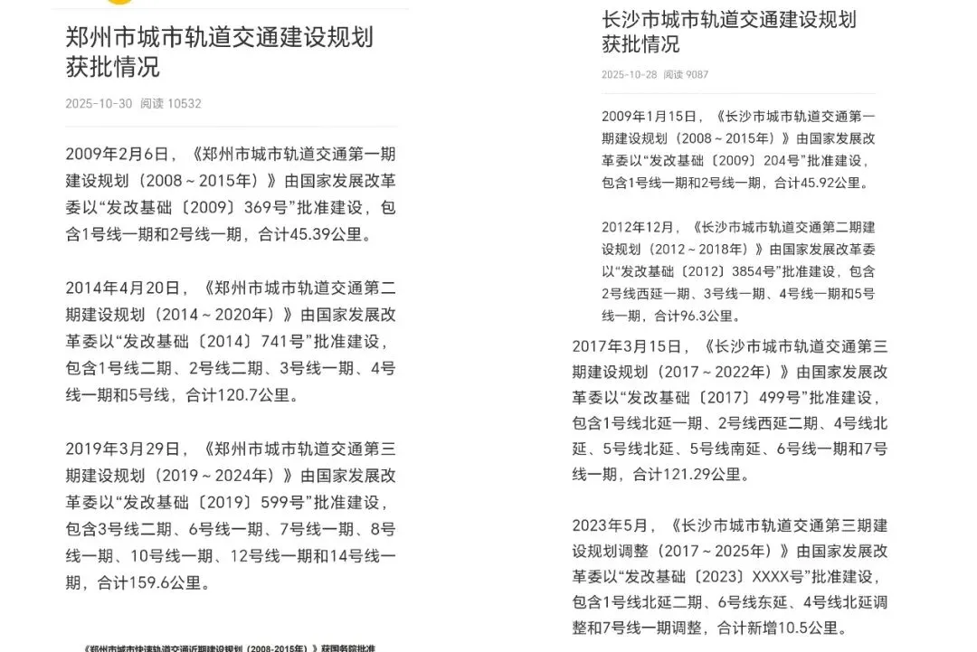 长沙和郑州两座中部地区城市常拿来对比,长沙轨道交通和郑州轨道交通都是同期批复,差不多同期开工建设,差不多同期开通首条的城市。