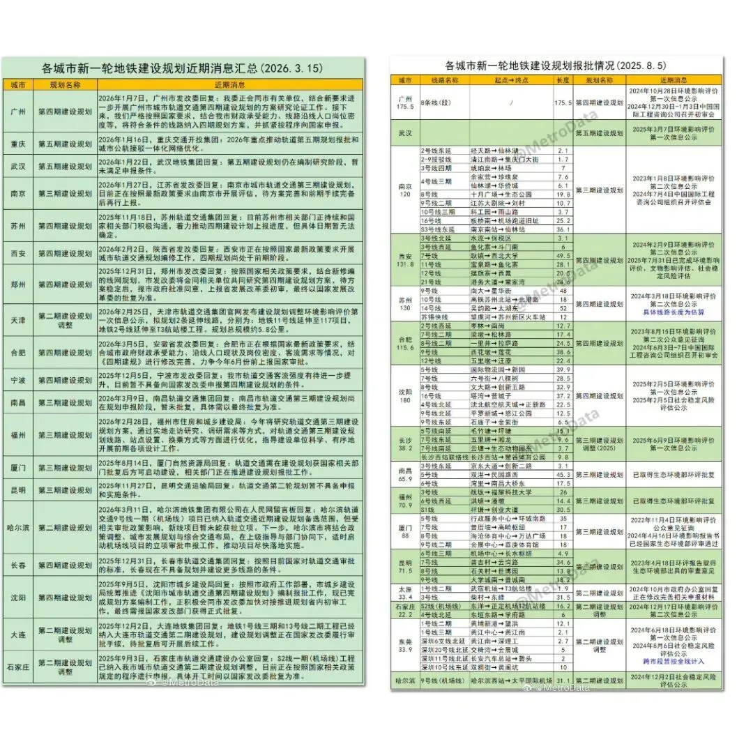 听闻近期郑州在规划四期线路网,也未知进度如何。但从去年获知的报批城市中暂无郑州,今年还重新编排四期纯地铁线路,信息如下图(图来自微博:MetroData)。长沙目前还在加紧三期纯地铁线路建设以及2022年获批《长株潭都市圈多层次轨道交通建设规划(2022~2027年)》中的三条市域线。