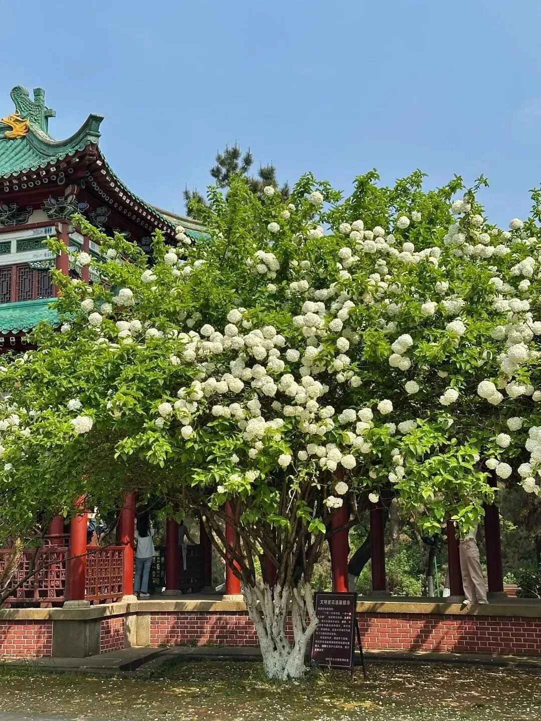 在湖南烈士公园内,朵朵木绣球花与园内古风建筑交相辉映,构成一幅如诗如画的春日美景。而在长沙高铁南站西广场,木绣球已迎来盛花期,嫩绿花苞由绿染白,花团层层叠缀枝头。此外,长沙城北开福区政府旁的长沙江湾妇产医院内,成片木绣球花海正迎春绽放,洁白如雪、圆润如玉的花球缀满枝头。