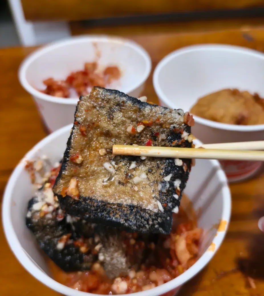 臭豆腐跟长沙不一样,这里炸出来是金黄色的,外皮脆,里面嫩,辣椒酱是另外调的,往嘴里一送,热气先顶上来,辣味跟着钻进鼻腔,吃完额头会出一层薄汗。夏天路边支着摊,嗦螺的香气往街上飘,本地人手持田螺,对着螺口一嘬,螺肉就进去了,动作干净利落,汤汁鲜得停不下来。
