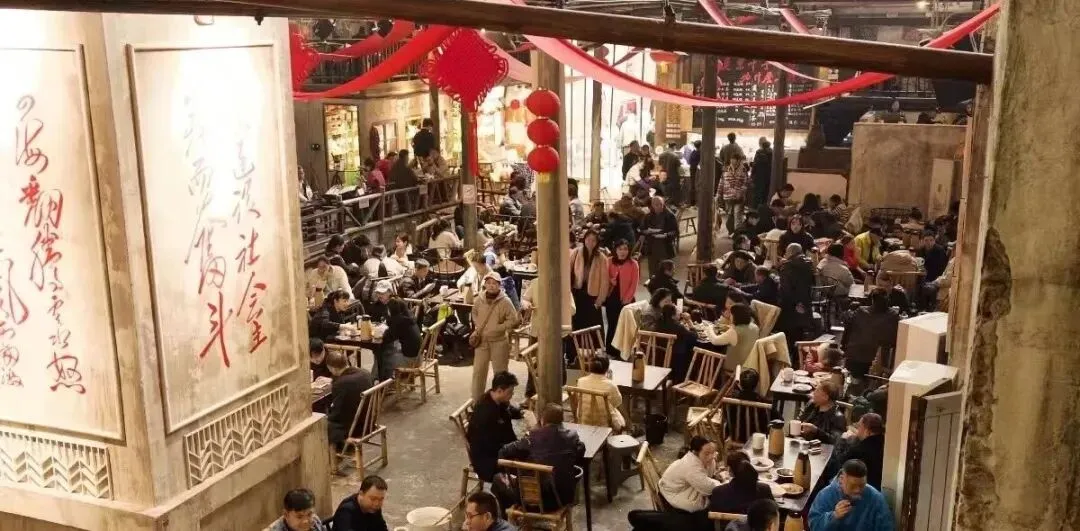 更关键的是,选址并未局限于纯商业街区,而是扎根老街巷之中,周边环绕着老社区、青石板路与民国建筑,本身就自带浓厚的市井氛围。茶馆由1952年建成的废弃工厂礼堂改造而成,改造过程中保留了原建筑的梁柱、斑驳墙面与时代标语,与周边的老长沙街巷风貌浑然一体,形成“闹中取静”的独特体验——游客能在逛完繁华商圈后,来此感受慢节奏的市井生活;本地居民则能随时走进茶馆,与老友闲谈小聚,这种“兼顾游客与本地人”的选址逻辑,让茶馆既有稳定的本地客群支撑,又有源源不断的游客流量,为火爆奠定了坚实基础。