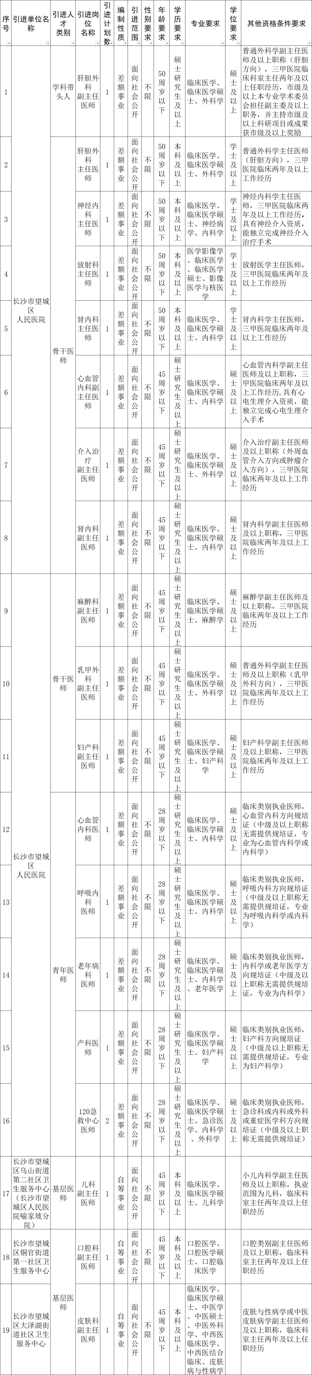 1.引进岗位、人数和具体资格条件详见《长沙市望城区2026年卫健人才引进岗位计划表》(附件1,以下简称《计划表》)。