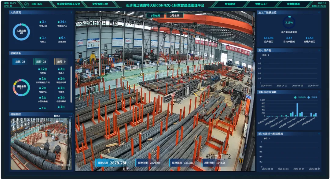 钢筋是桥梁的“骨架”。传统钢筋加工靠人工翻样、下料,效率低、误差大。项目部建起了一座钢筋智能生产“云工厂”,以数字化重构生产流程。钢筋生产业务管理系统覆盖基础资料维护、材料出入库管理、生产计划制定、加工单制作、断料优化、加工配送、节超分析、钢筋设备远程控制等全链条环节。智能翻样软件替代传统手工翻样,有效避免数据偏差,提升了翻样效率与精度。物联网远程加工系统将加工指令从云端一键下发,直连数控设备,实现远程生产加工。