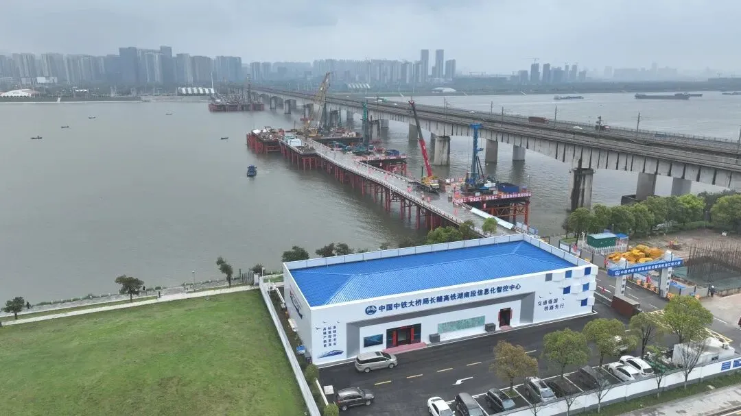 新建长赣高铁长沙湘江铁路特大桥紧邻既有石长铁路,最小净距仅15.57米;主桥横跨湘江航道,船只往来密集;桥墩要扎进水下几十米深的坚硬岩石里——桥梁施工必须在铁路和航道一刻不中断的情况下攻克一道道难关。