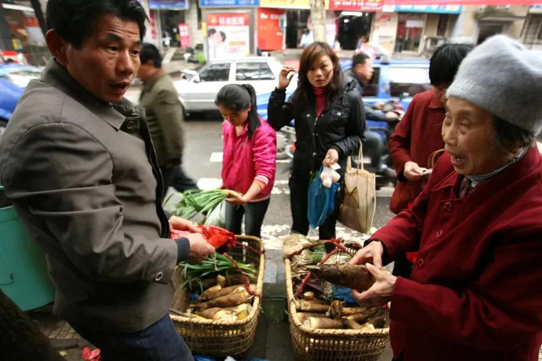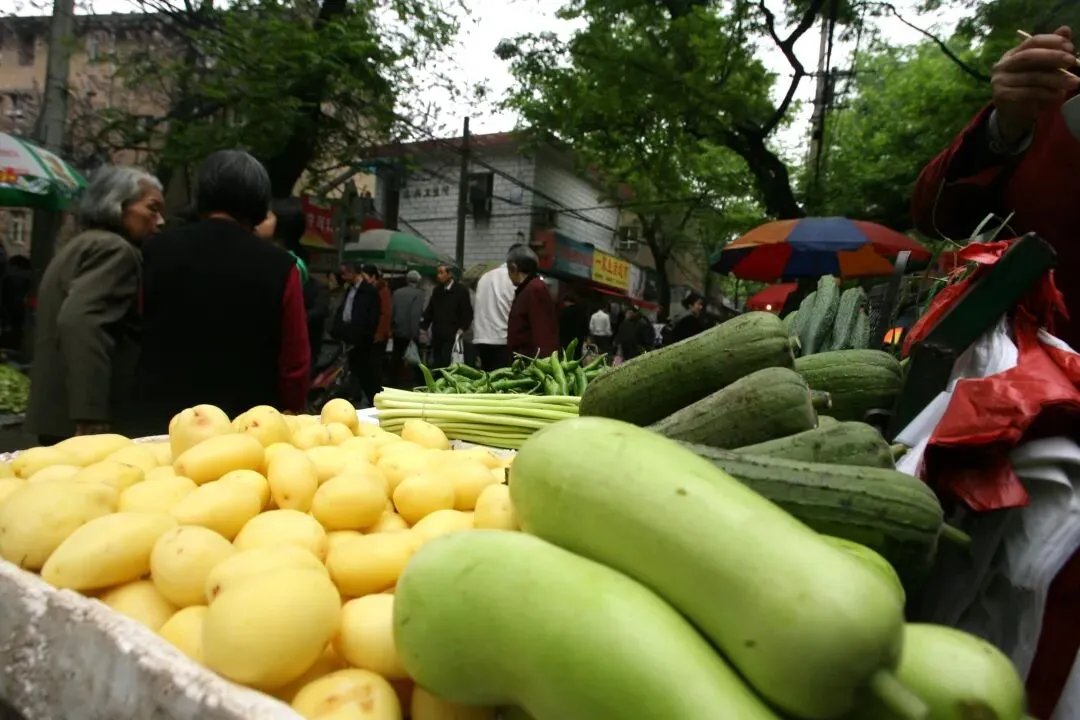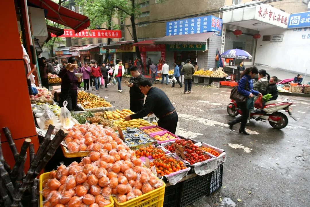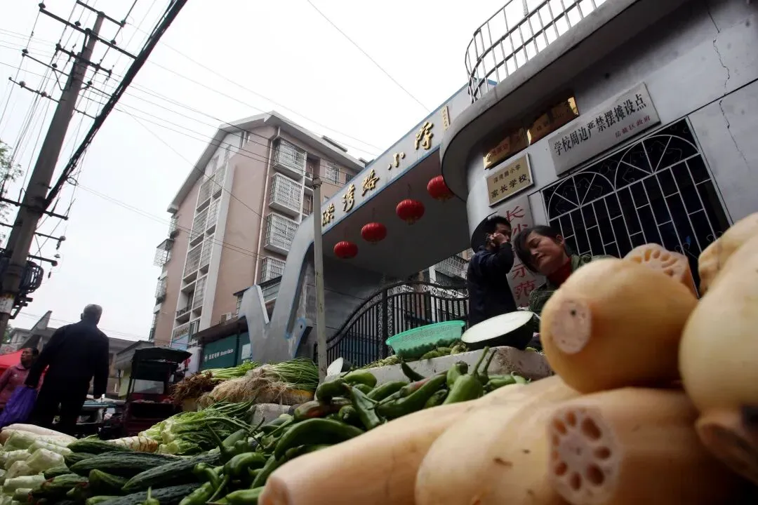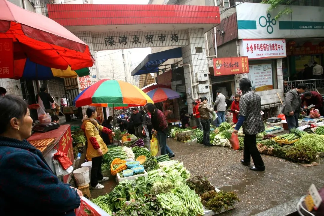 2010年3月31日,长沙岳麓区溁湾农贸市场外,摆满了菜摊子,把溁湾路小学的门也堵住了,虽然秩序杂乱无章,但烟火气浓厚。