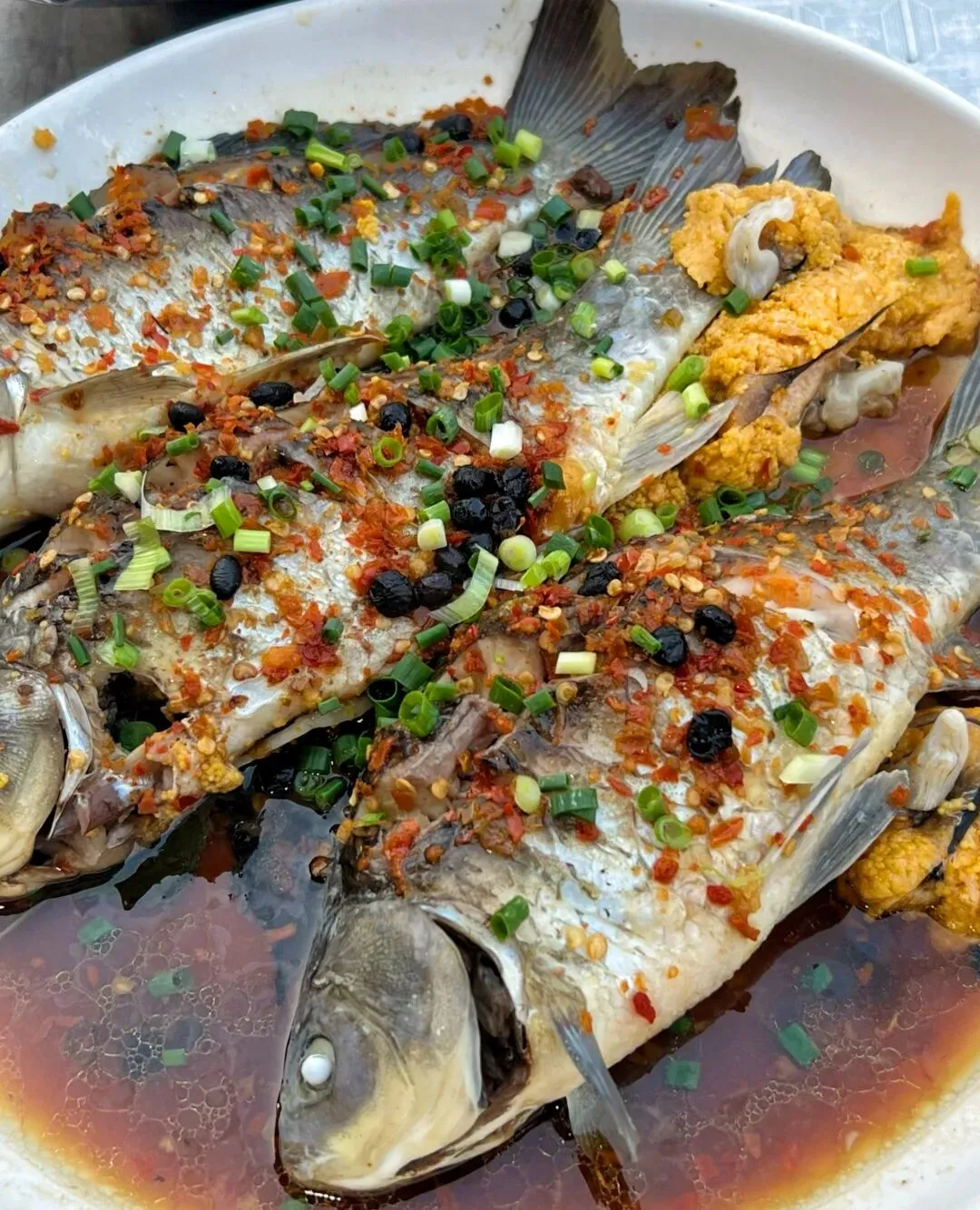 豆豉辣椒蒸鲫鱼,这个现蒸的鲫鱼,趁热吃很香,而且没有土腥味,鱼肉新鲜还有些鲜甜,鱼籽蘸着这蒸出来的酱水吃也很美味,只是鲫鱼还是刺多,吃起来有点麻烦,哈哈。