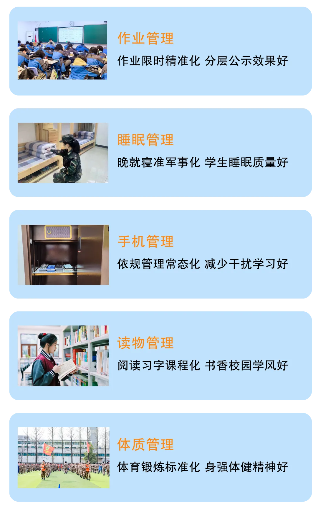 2.吃、穿、住、行、用准军事化管理;