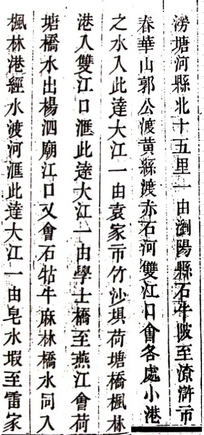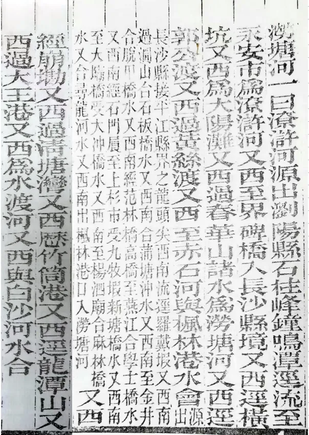 涝塘河,县北十五里,一由浏阳县石牛陂,至潦浒市、春华山、郭公渡、黄丝渡、赤石河、双江口,会各处小港之水,入此达大江。一由袁家市、竹沙坝、荷塘桥、枫林港入双江口,汇此达大江。一由学士桥至燕江,会荷塘桥水,出杨泗庙江口,又会石牯牛、麻林桥水同入枫林港,经水渡河,汇此达大江。一由皂水塅至雷家桥、白沙河、洋石潭、罗汉庄,入此达大江。