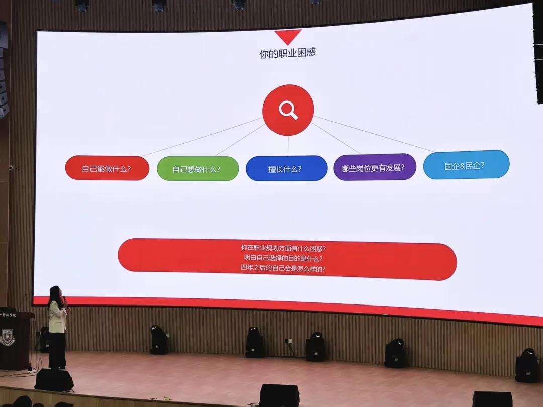 本次讲座一大亮点在于极强的实用性与可操作性,全程围绕 “大一能做什么、马上能做什么” 展开。邱老师详细讲解了霍兰德职业倾向六边形理论,帮助同学们识别性格、兴趣与职业的匹配度;在企业人才需求解读环节,她以档案数字化产品经理为例,完整拆解企业招聘的核心维度;结合复合型人才需求,她给出从大一到大四的分阶段成长路径,为新生提供清晰的时间管理与成长框架。