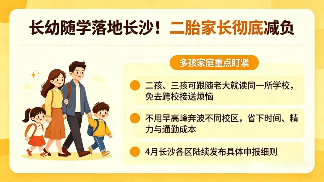 对长沙二胎、三孩家庭来说,这项政策直接解决了最头疼的接送难题,再也不用全家分工、两头奔波,妥妥的育儿减负红利!