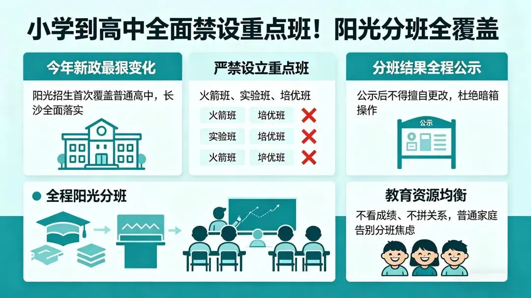 今年新政最狠的变化,就是阳光招生首次覆盖普通高中,长沙全面落实,彻底告别重点班、快慢班!