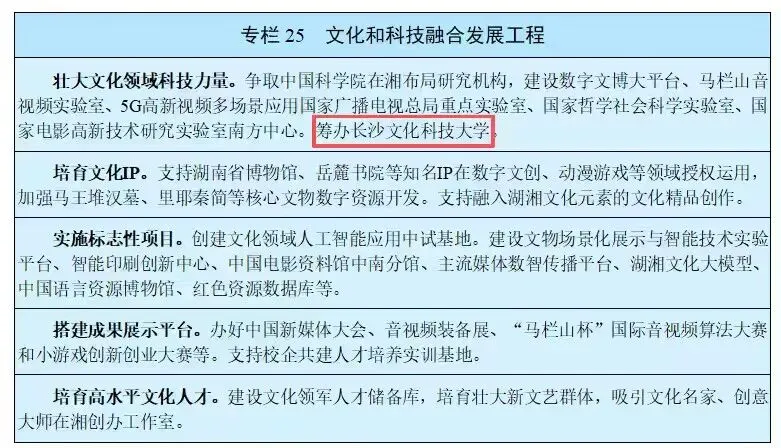 湖南省国民经济和社会发展第十五个五年规划纲要,明确表示筹办长沙文化科技大学。