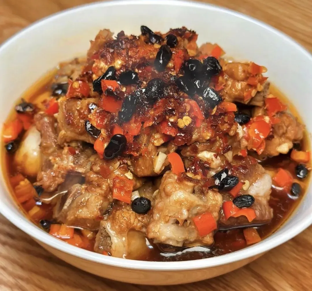 豆辣蒸排骨、玉米虾仁、长豆角炒肉、清炒齐心白、紫菜蛋汤。