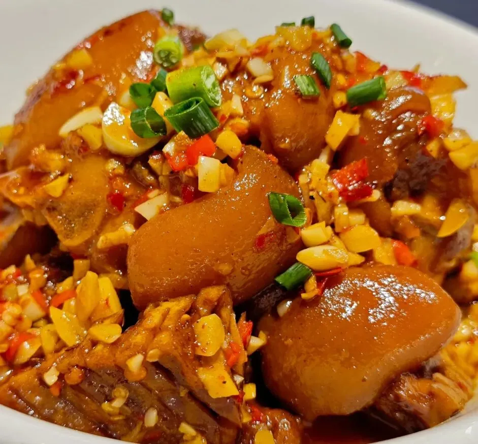 兰花干子烧猪脚、茭白炒肉、清炒藕片、清炒包菜丝、海带龙骨汤、酸奶。