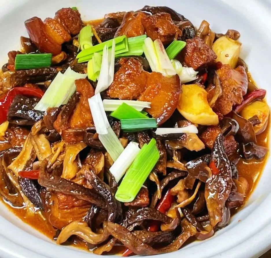 鹿茸菇红烧肉、水蒸蛋、胡萝卜炒肉、清炒上海青、玉米龙骨汤。