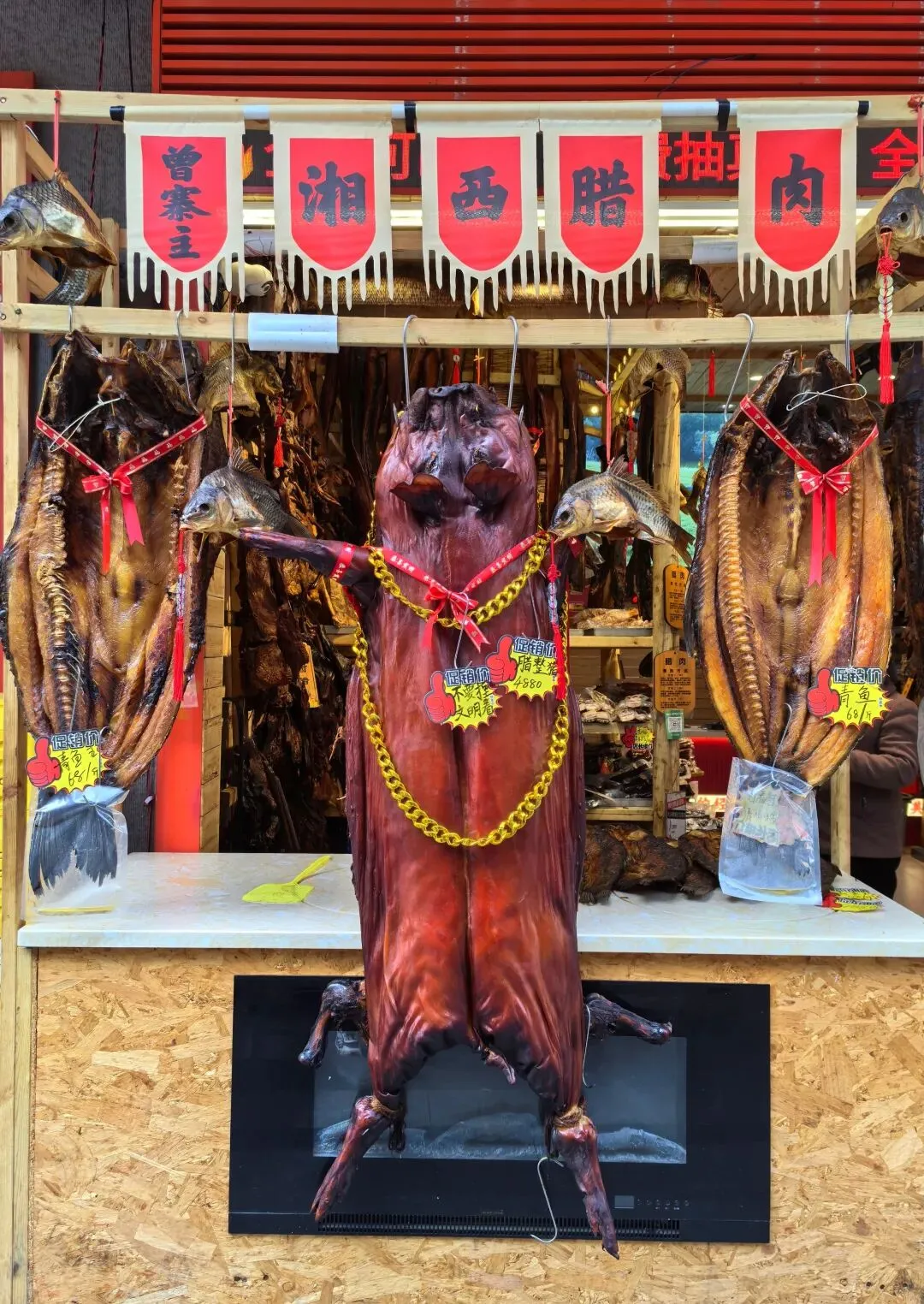 这只熏猪挂着大金链子,系着红丝带,昂首迎客。它两边,还各摆着一条巨大的青鱼。