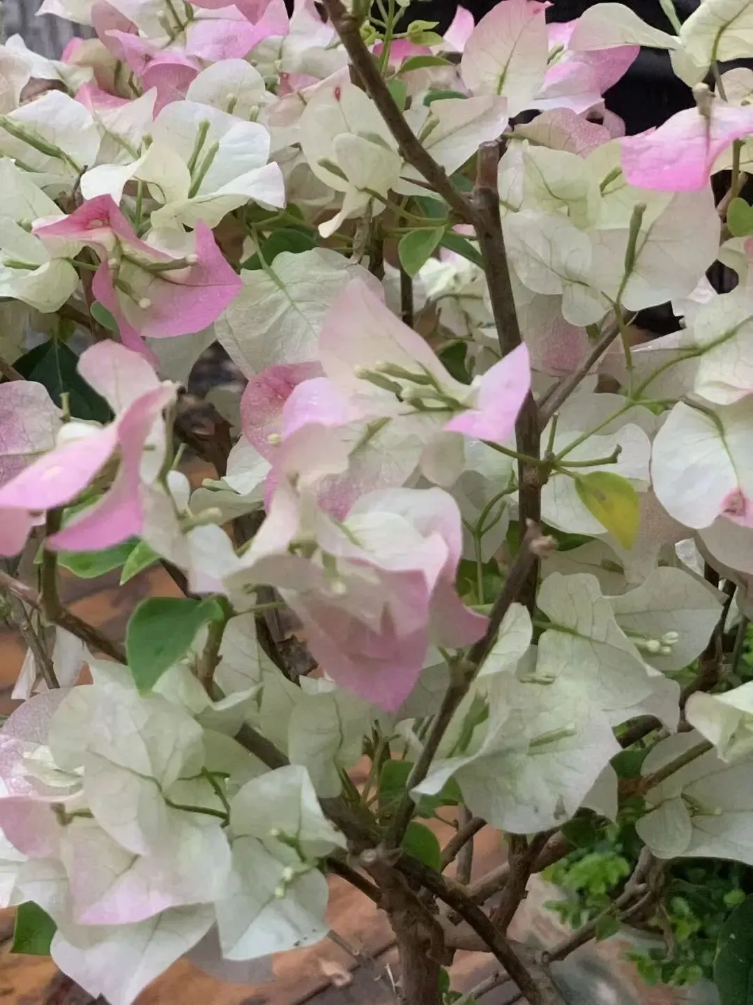 三角梅清雅灵动,白瓣裹着淡粉,在微风细雨里轻轻摇曳。