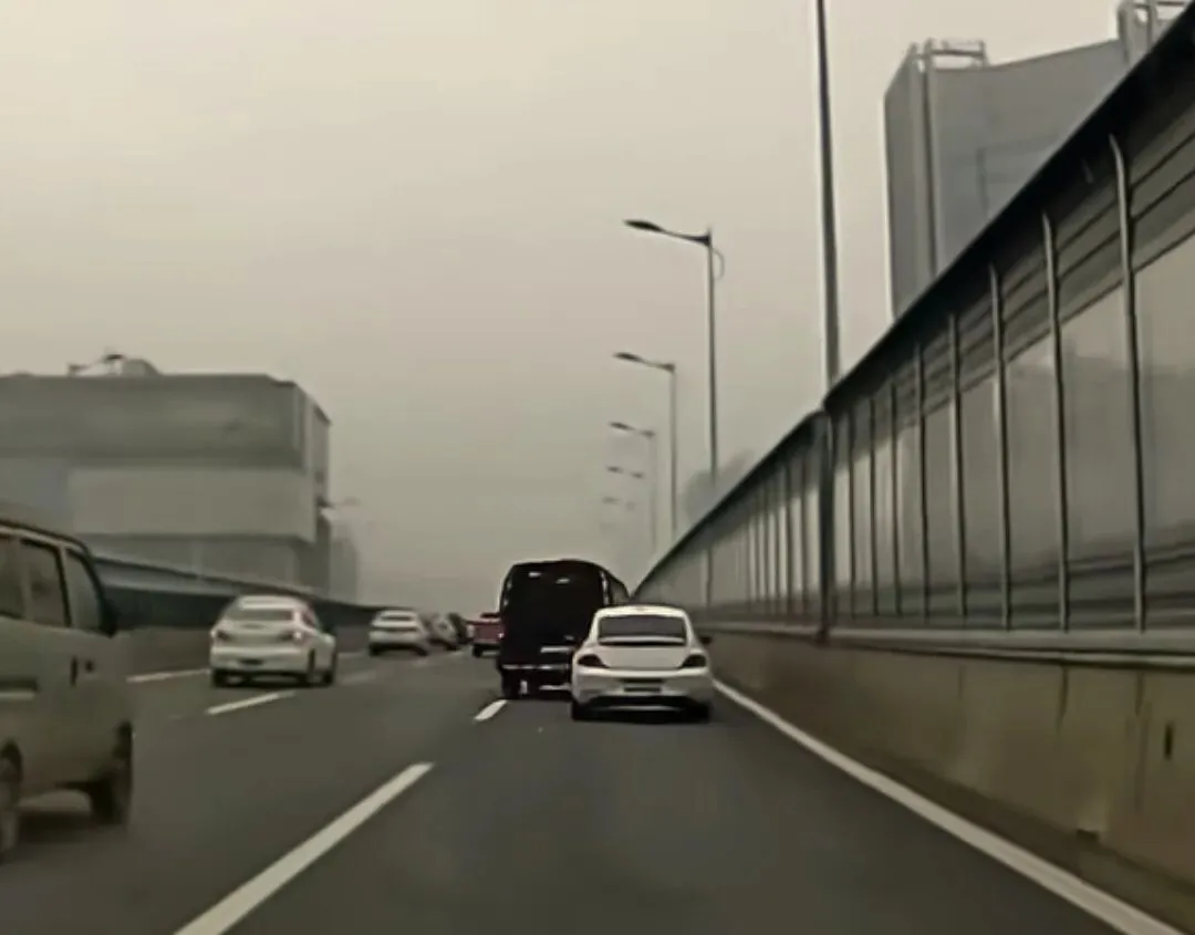视频显示,当时路况处于缓行状态,一辆白色轿车在主路直行车道正常行驶,而黑色运钞车位于右侧匝道区域。
