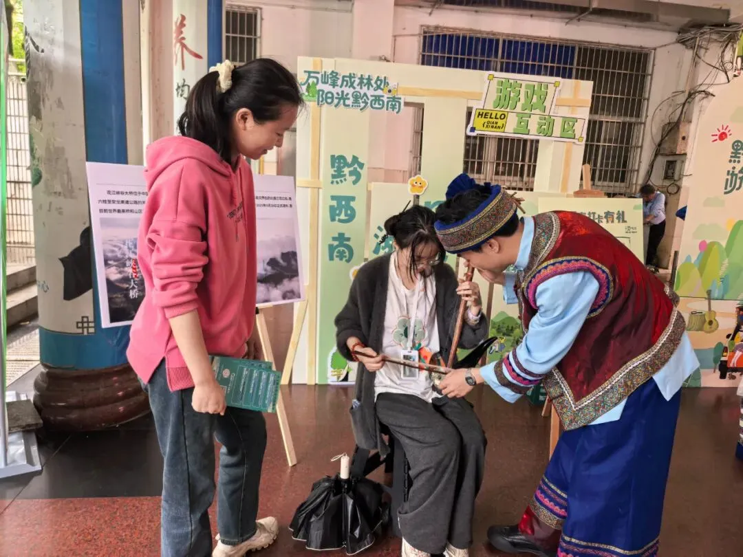 在中南大学,黔西南浓郁厚重的民族人文风情深深吸引着在场学子。学子们围在羊角胡、月琴旁请教,轻拨琴弦,沉浸于传统民乐的婉转悠扬;一片木叶吹出悦耳旋律,大家争相体验,惊叹于少数民族独有的浪漫;动感欢快的彝族《阿妹戚托》舞步,带动学子们与彝族阿妹共舞,体会“贵州村舞”的活力;精美的民族服饰更吸引学子穿戴打卡。