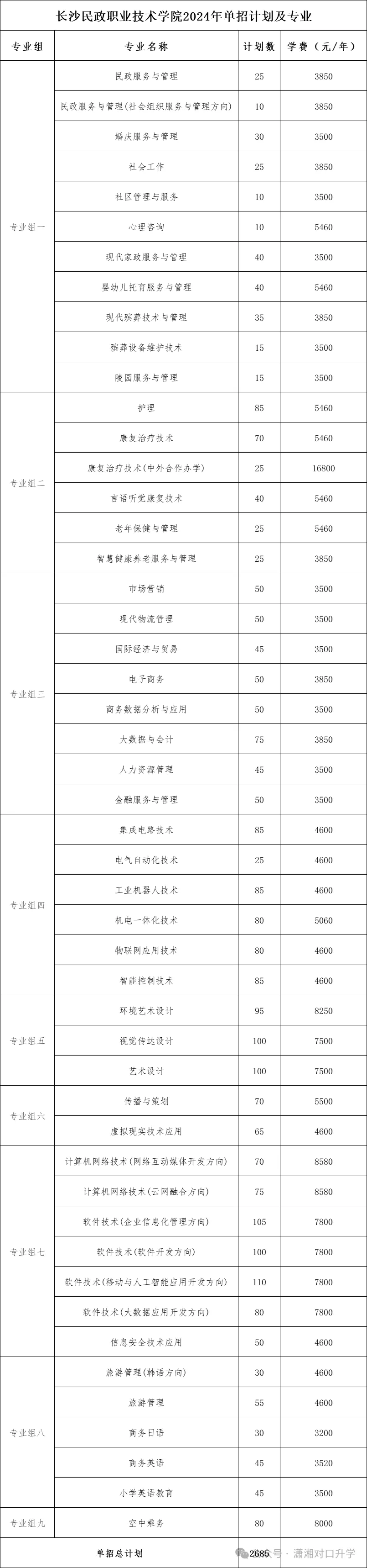 八、长沙民政职业技术学院2024年省内单招计划