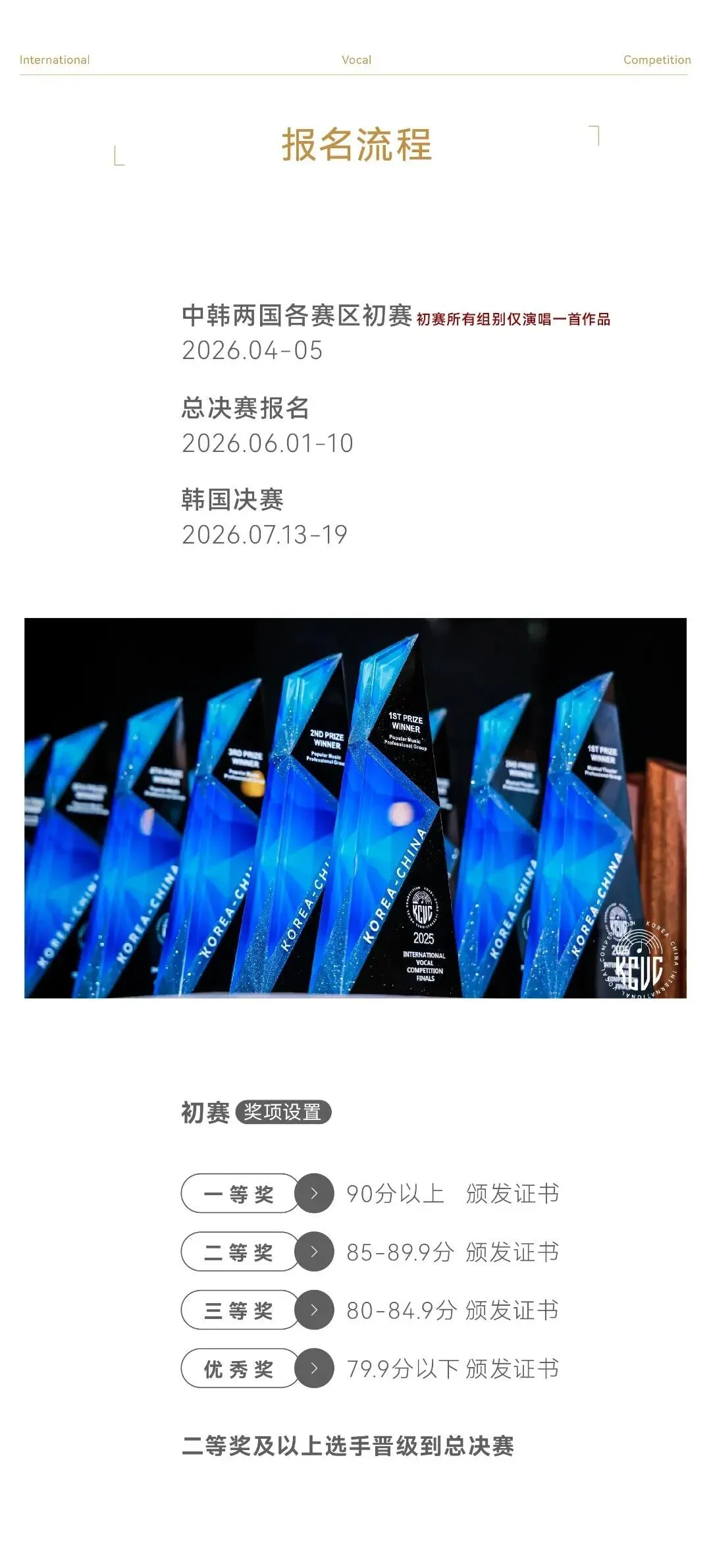 *一等奖及二等奖(85分以上)选手获得晋级韩国决赛资格,将于2026年7月13日-19日在韩国首尔进行。
