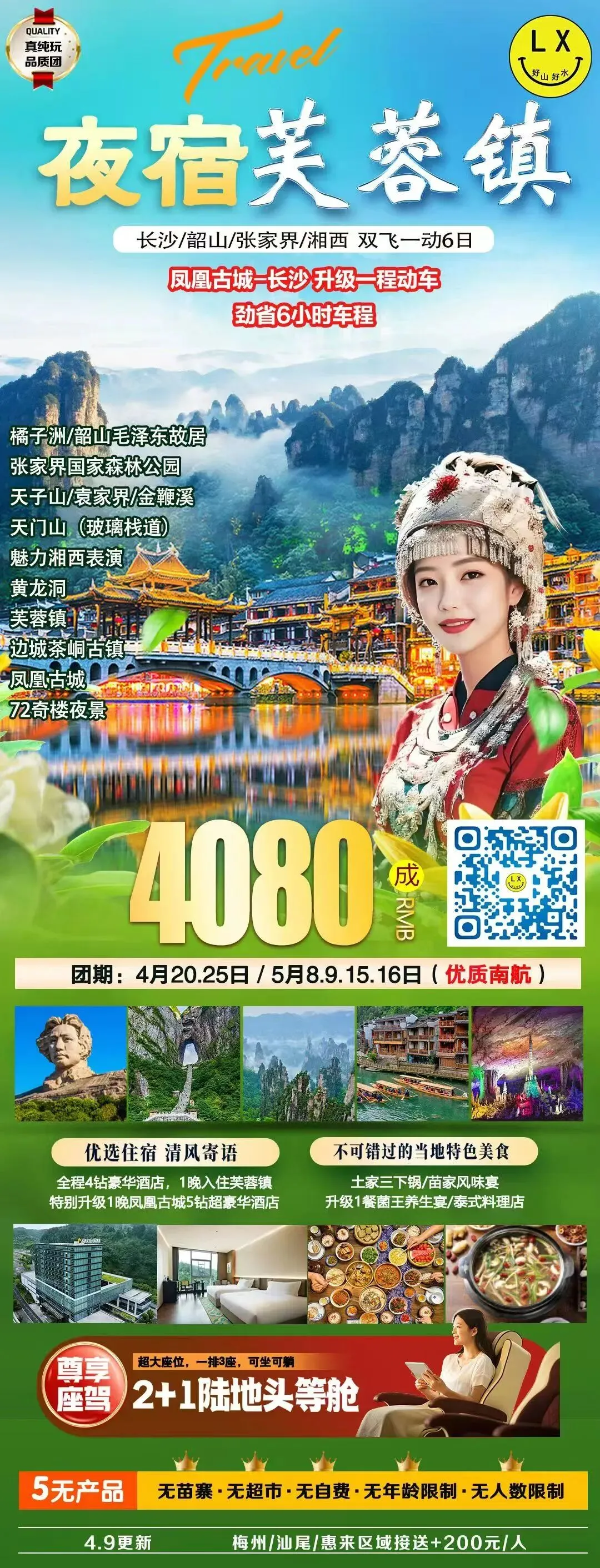 大交通:揭阳/长沙往返机票(往返机票含机建+燃油)+【凤凰-长沙单程高铁】。(团队机票将统一出票,一经开出,不得更改、不得签转、不得退票)(如因旺季凤凰至长沙高铁票无票则改成张家界至长沙动车,无退任何差价,请悉知)