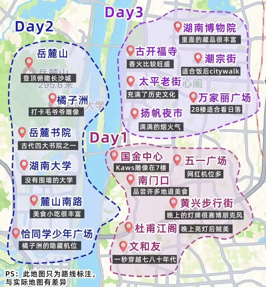 - 路线(东门进→南门出):东门乘索道上山30元(开放式吊椅,俯瞰湘江超绝)→ 山顶观光长廊(拍长沙全景)→ 云麓宫(道观)→ 古麓山寺 → 爱晚亭(“停车坐爱枫林晚”)→ 岳麓书院(四大书院之一,门票40元,朱张会讲旧址)。