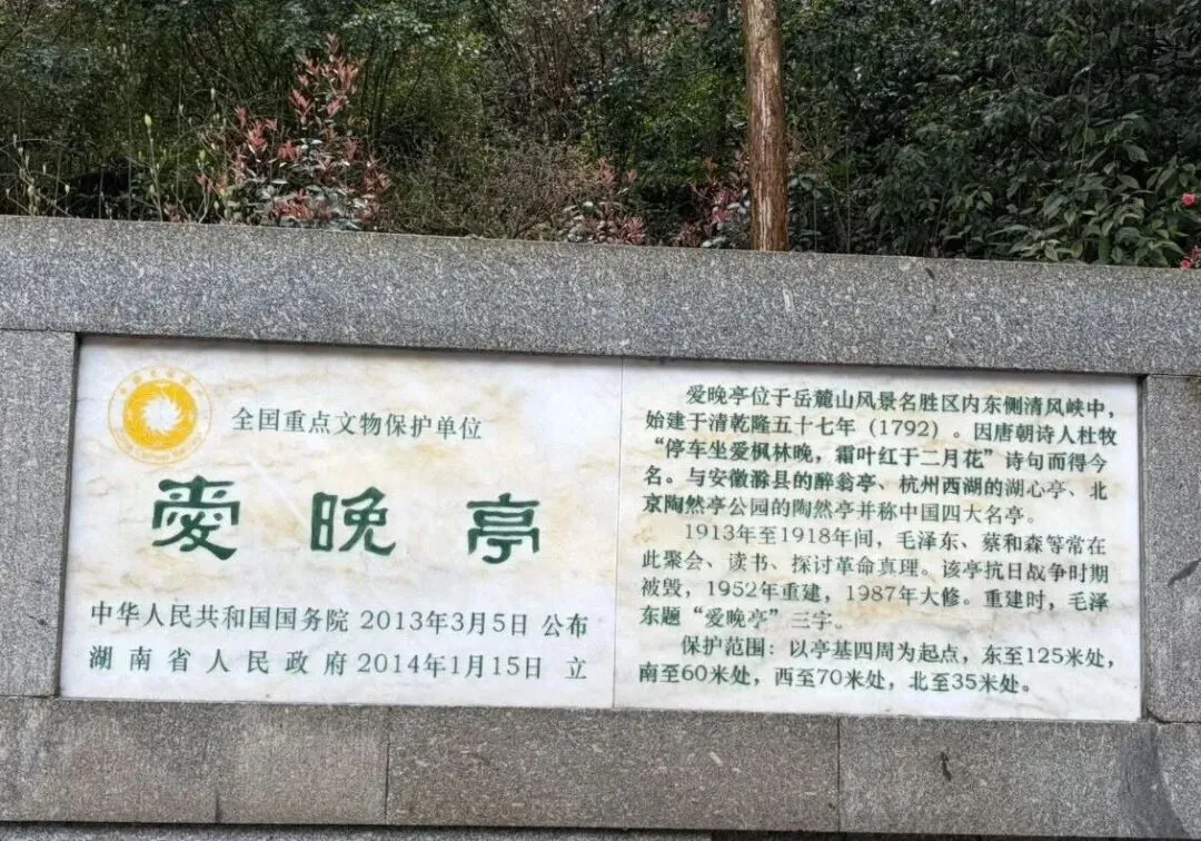 离开岳麓书院的不远处便是爱晚亭,这座因杜牧 “停车坐爱枫林晚” 得名的亭子,不只是赏枫胜地,更是当年毛泽东、蔡和森等进步青年纵论天下、探寻救国之路的地方,他们在这里激扬文字,为中国的未来点燃思想的火种。