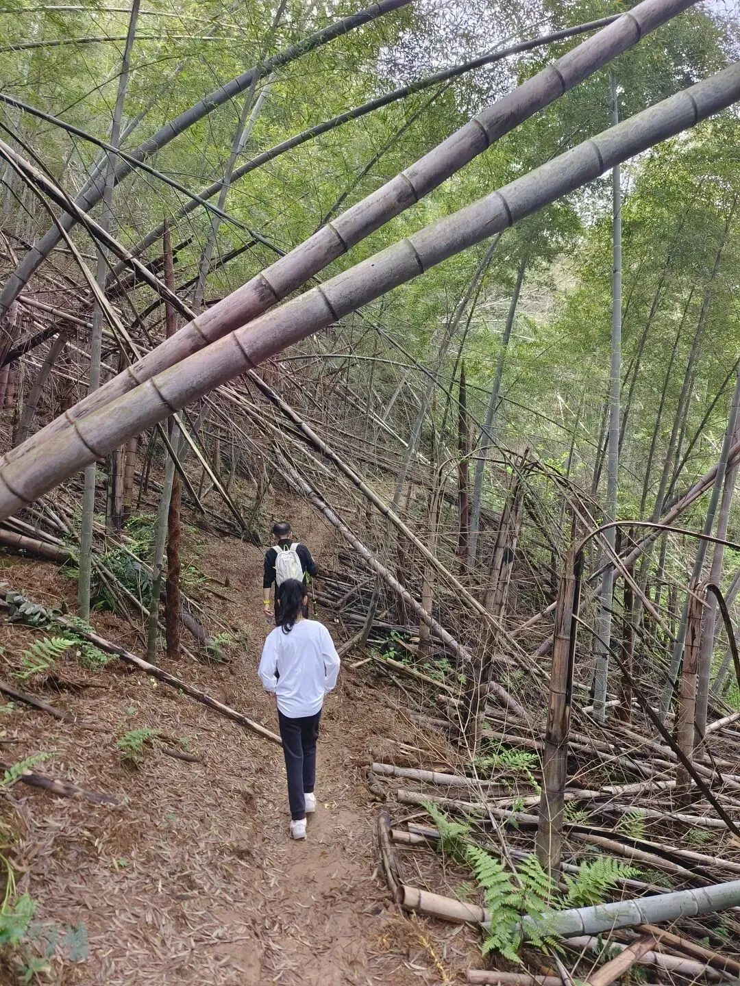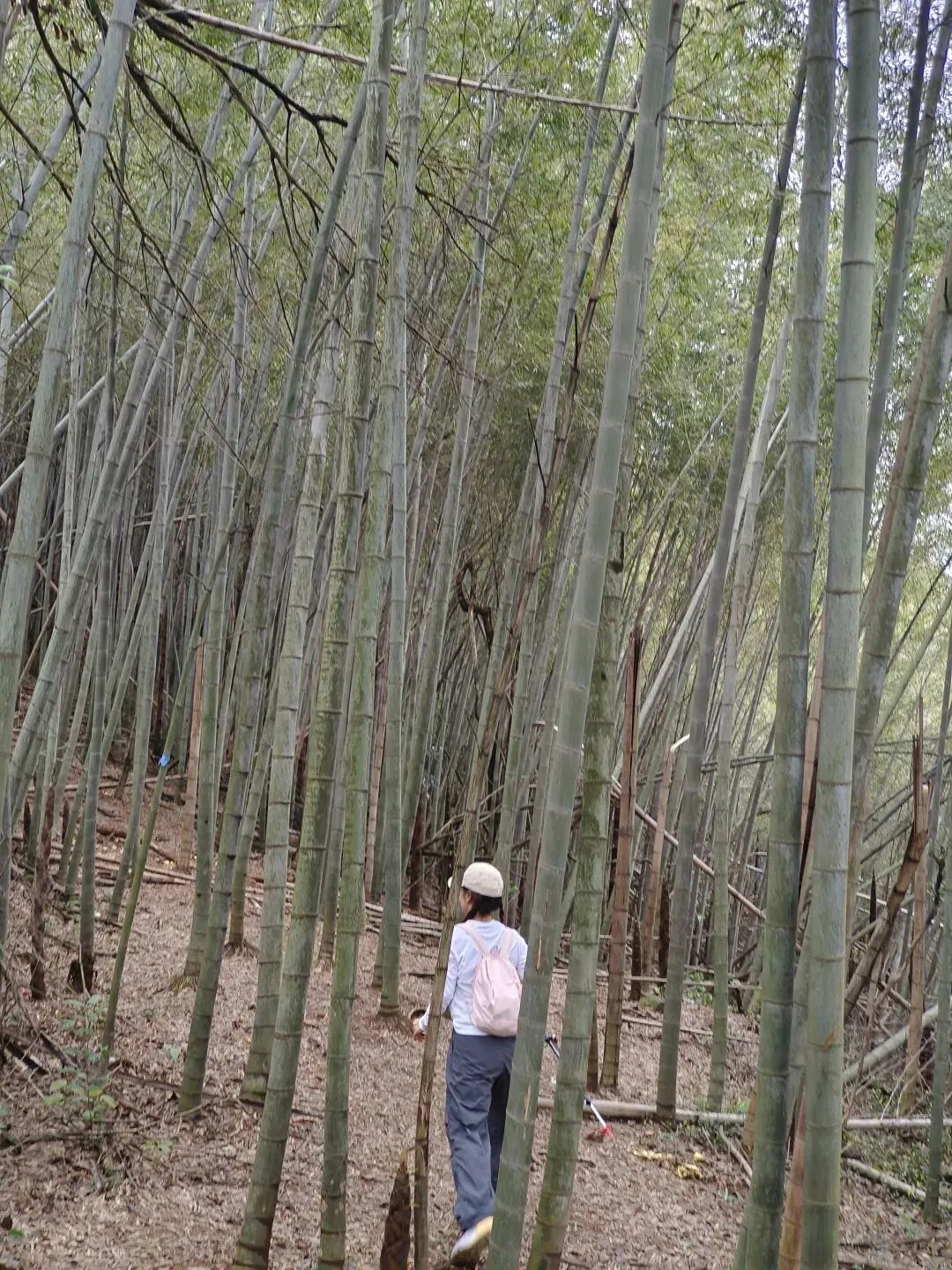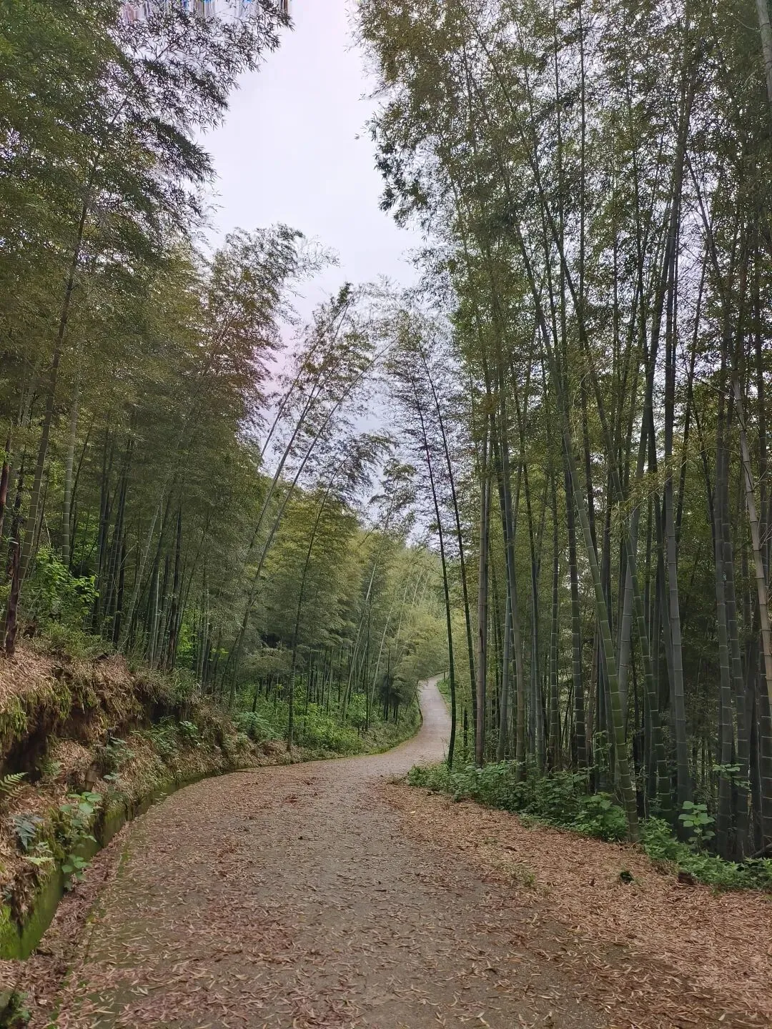 跟着导航走了一段景区路,然后一头扎进竹林土路。虽然刚下过雨,但地上铺着一层厚厚的竹叶,走起来一点不沾泥,软软的,像踩在地毯上。