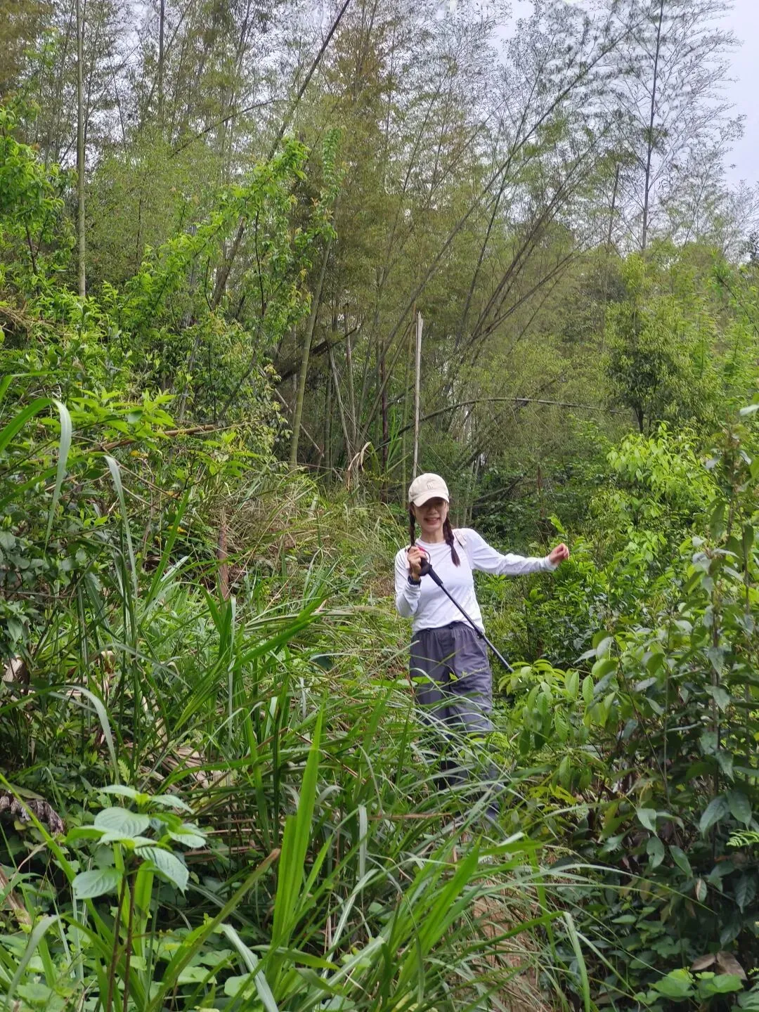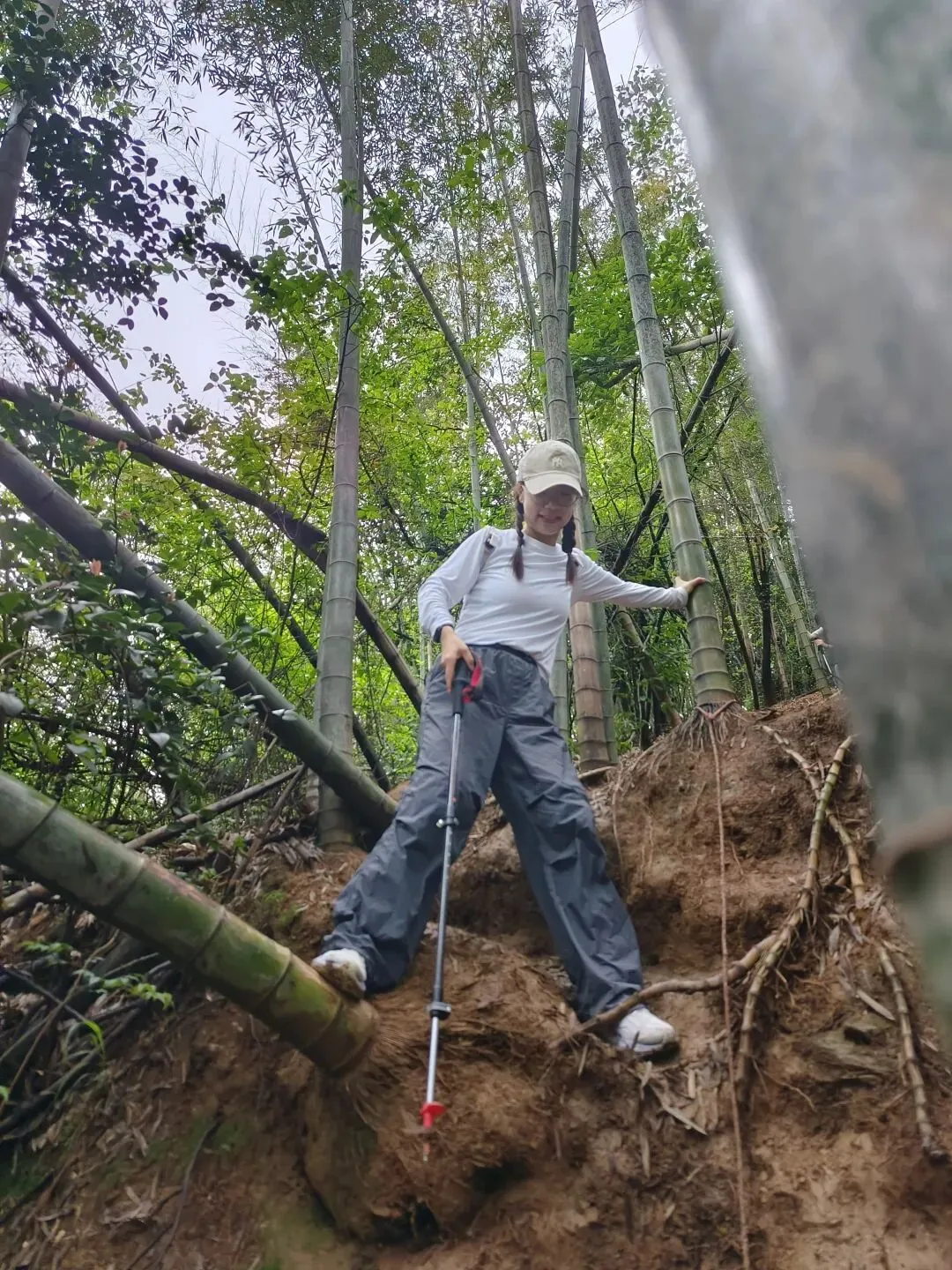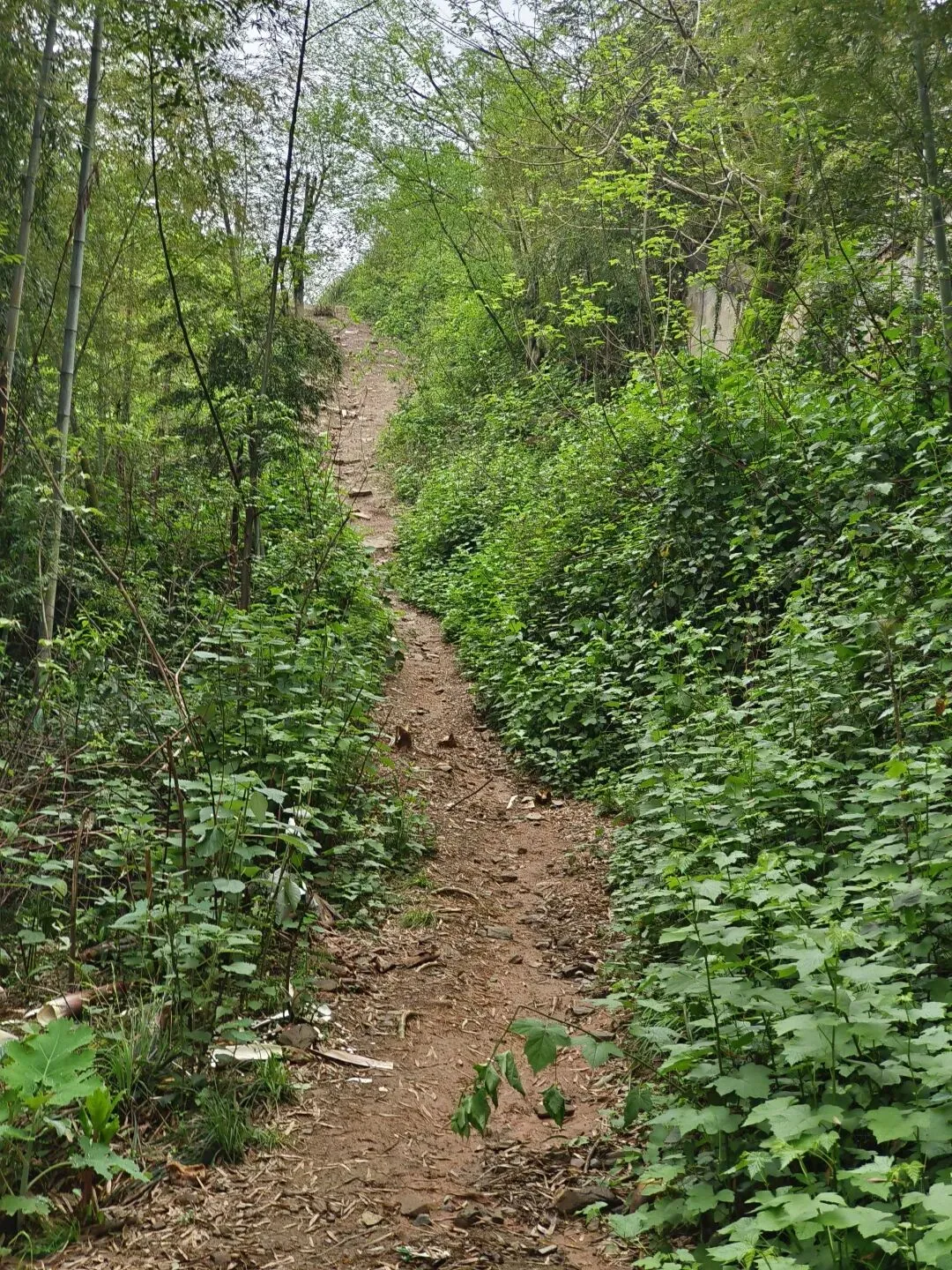 跟着导航走了一段景区路,然后一头扎进竹林土路。虽然刚下过雨,但地上铺着一层厚厚的竹叶,走起来一点不沾泥,软软的,像踩在地毯上。