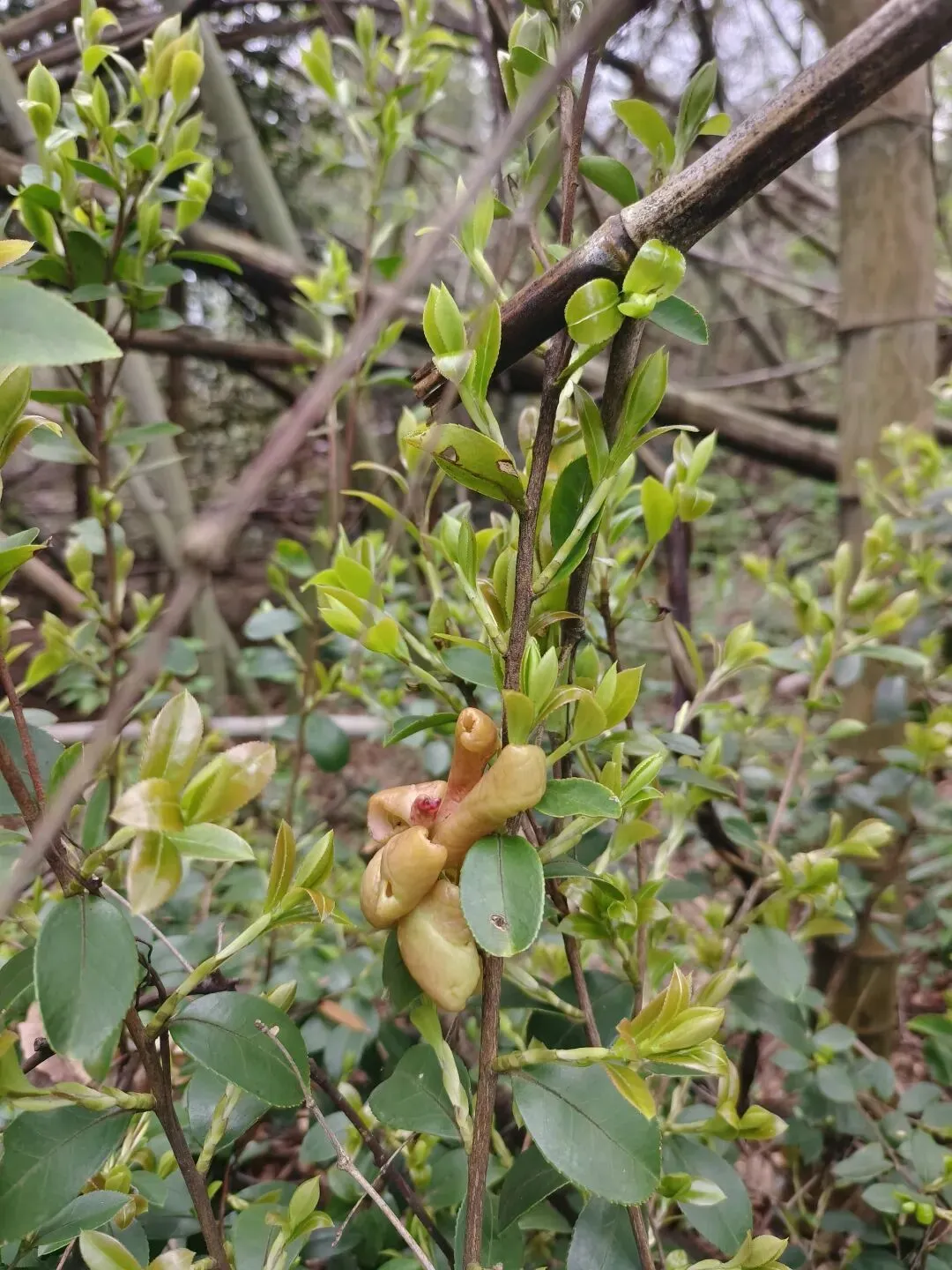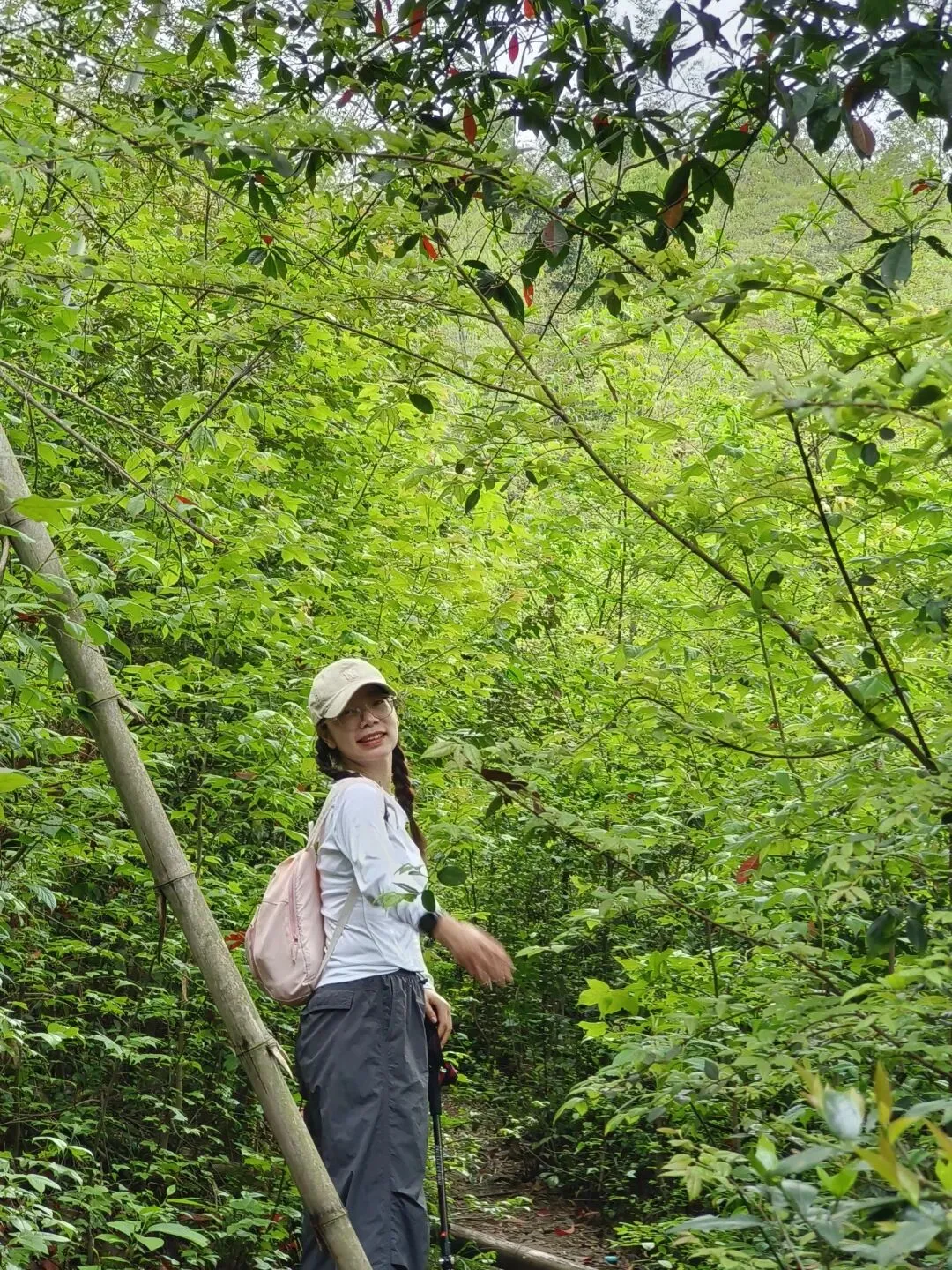 新绿满眼,空气清冽。路边时不时冒出一丛紫藤花,一挂一挂地垂着,像紫色的风铃;还有茶花片、蕨,甚至在一段枯木上发现了木耳。