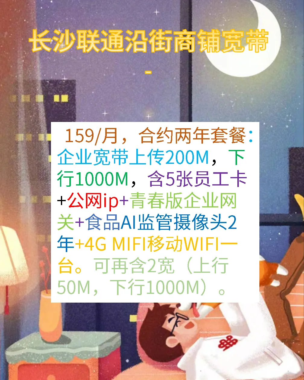 长沙沿街商铺AI监管部署:适用于餐饮;火锅店;民宿酒店;旅馆的联通企业宽带+摄像头安装.联通智赋万企159档.