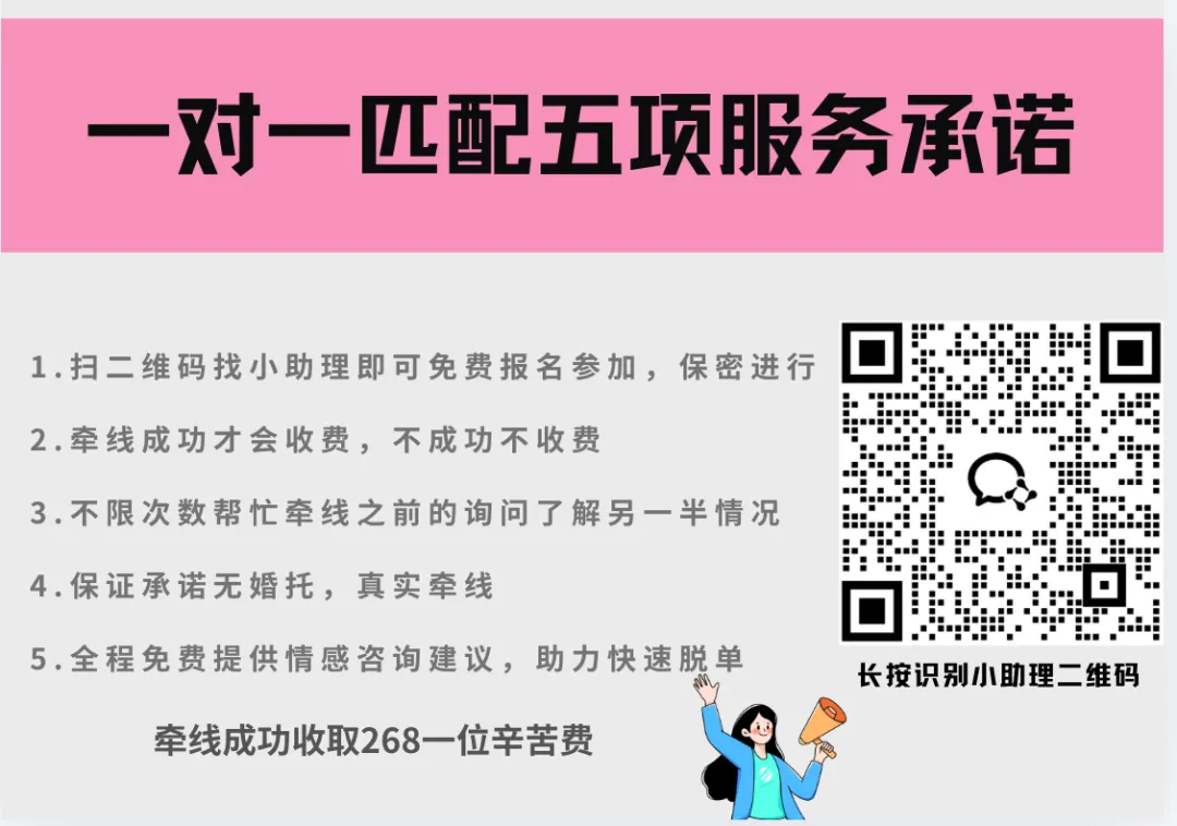 小助理会根据您的要求结合自身情况主动帮您从单身人士资源库中人工筛选出匹配度最高的小伙伴做成资料卡片发送给您查看,您觉得满意以后再去问对方的意愿,牵线前做到清楚了解对方的个人情况,在小助理的撮合协商转达告知下,双方都有意愿进一步认识再安排牵线,牵线前双方资料+照片互换,尊重彼此意愿,有基础的进行相亲认识,不耽误大家时间。