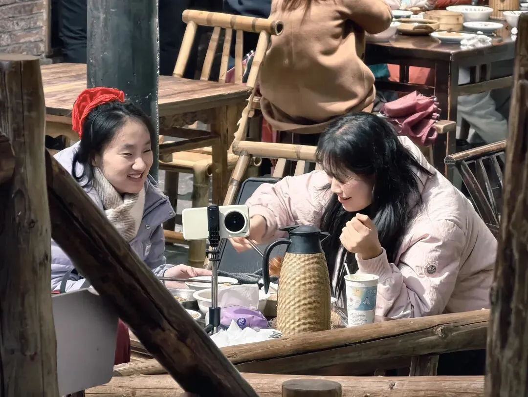 也能看到年轻人举着手机拍照打卡,在老标语墙前留影,或边喝茶边直播。
