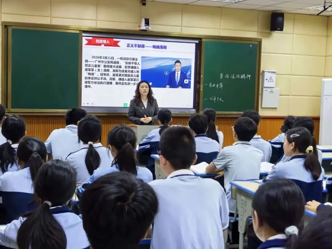 在长沙市明德华兴中学唐艳丽老师的初中道德与法治课《崇尚法治精神》中,她以“梅姨落网”这一真实案件为导入,引导学生深入理解自由的边界与平等的价值。课堂上,唐老师组织学生举一反三、学以致用,帮助学生认识到:法治既是对自由的保障,也是对自由的必要约束,只有在法律的框架内,自由才能真正实现,而公平正义的最终落地,正是法治精神最有力的体现。