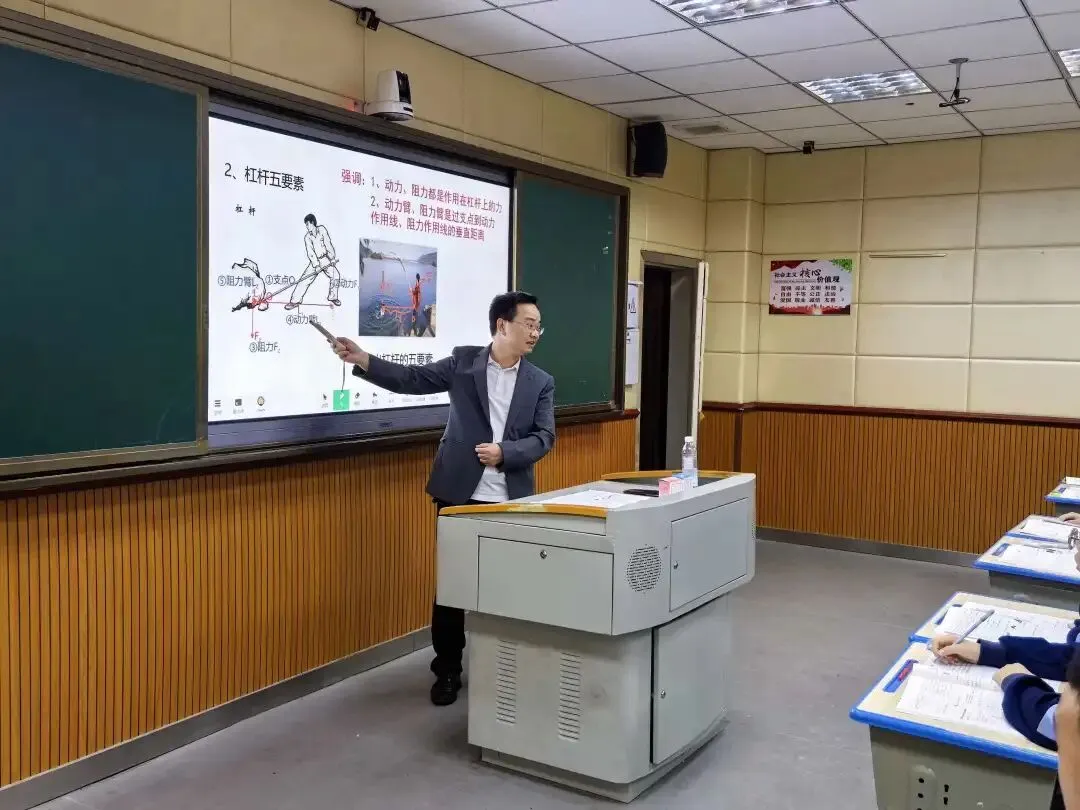 长沙市明德华兴中学郑森老师的初中物理示范课《简单机械》。在讲解杠杆时,他借助真实生活场景中的杠杆图片,直观生动地引导学生认识并掌握杠杆的五要素。随后,他带领学生分析实验数据,共同归纳得出杠杆平衡条件,并在此基础上进行知识延伸,进一步介绍动滑轮的实质——一种省力杠杆。整节课层层递进,逻辑清晰,有效帮助学生将生活现象与物理原理紧密结合。