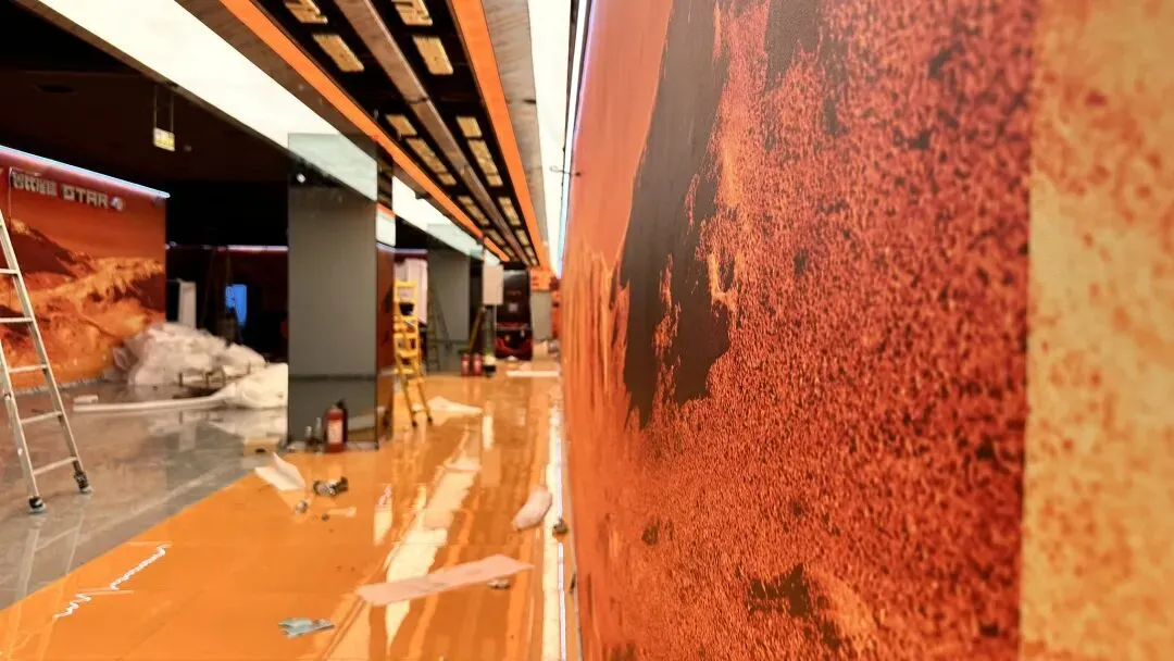 从入口处未来感的品牌门头,到店内贯穿全场的火星地貌视觉墙,每一处广告物料都不再是孤立的宣传载体,而是空间叙事的重要组成部分。暖橙主色调与赛博霓虹灯光交织,将品牌IP、活动海报、价目表等信息,自然融入赛博朋克风的场景设计中,既清晰传递了优惠福利,又强化了沉浸式探险氛围。