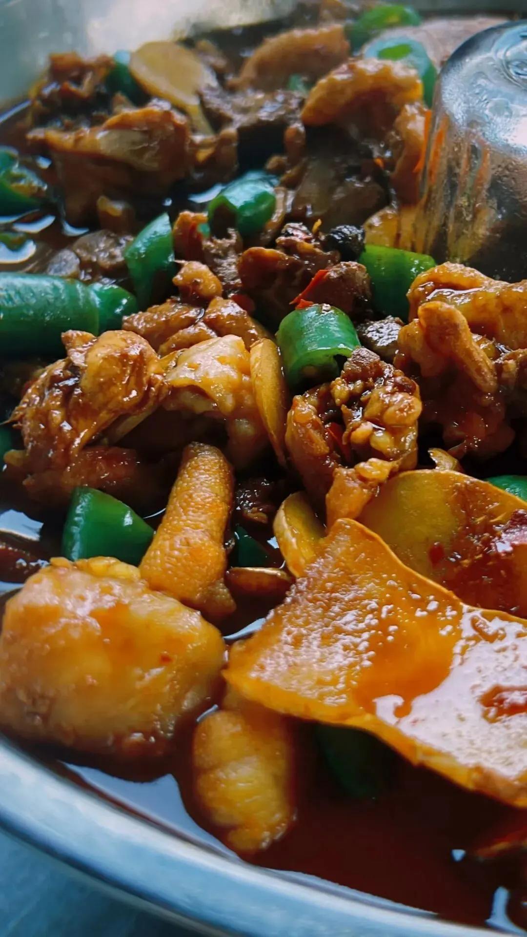 三黄鸡去骨切块,混合啤酒、黄酒、料酒,和青椒一起慢炖。