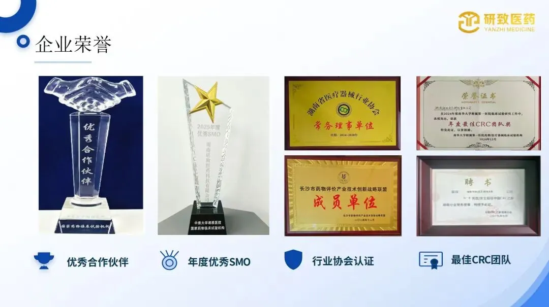 公司成立于2017年1月。成立至今已经承接项目700余项,包括SMO项目360+项;招募项目350+项目。累计合作的甲方数量200+个;合作机构近40家。曾荣获中南大学湘雅医院2025年度优秀合作伙伴;南华大学附属第一医院最佳CRC团队,SMO优选单位,中南大学湘雅二医院SMO优选单位等荣誉。