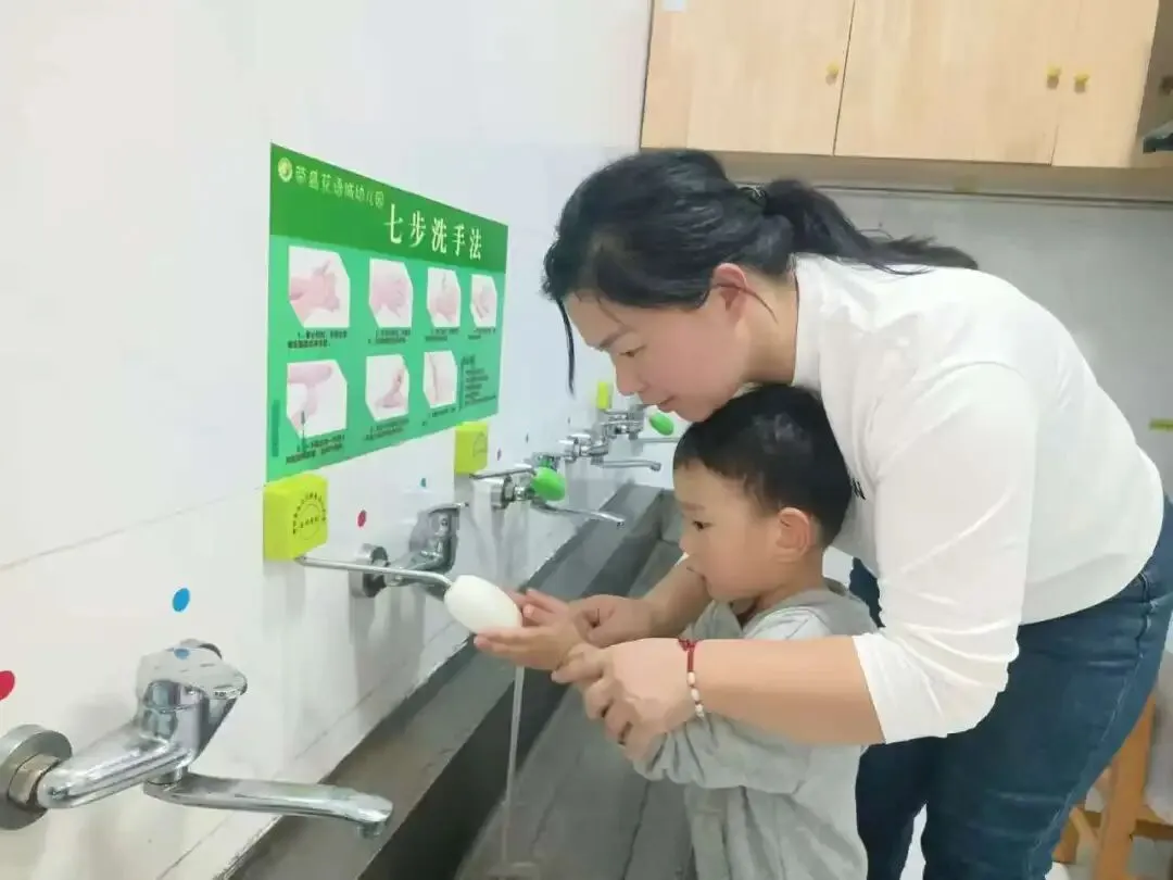 当然,“兔妈妈”也有严格的一面:她会将洗手、喝水、收拾玩具编成小故事,“小手洗白白,细菌不见啦”“多喝水,身体棒”等,慢慢地,孩子们便把这些约定记在了心里。